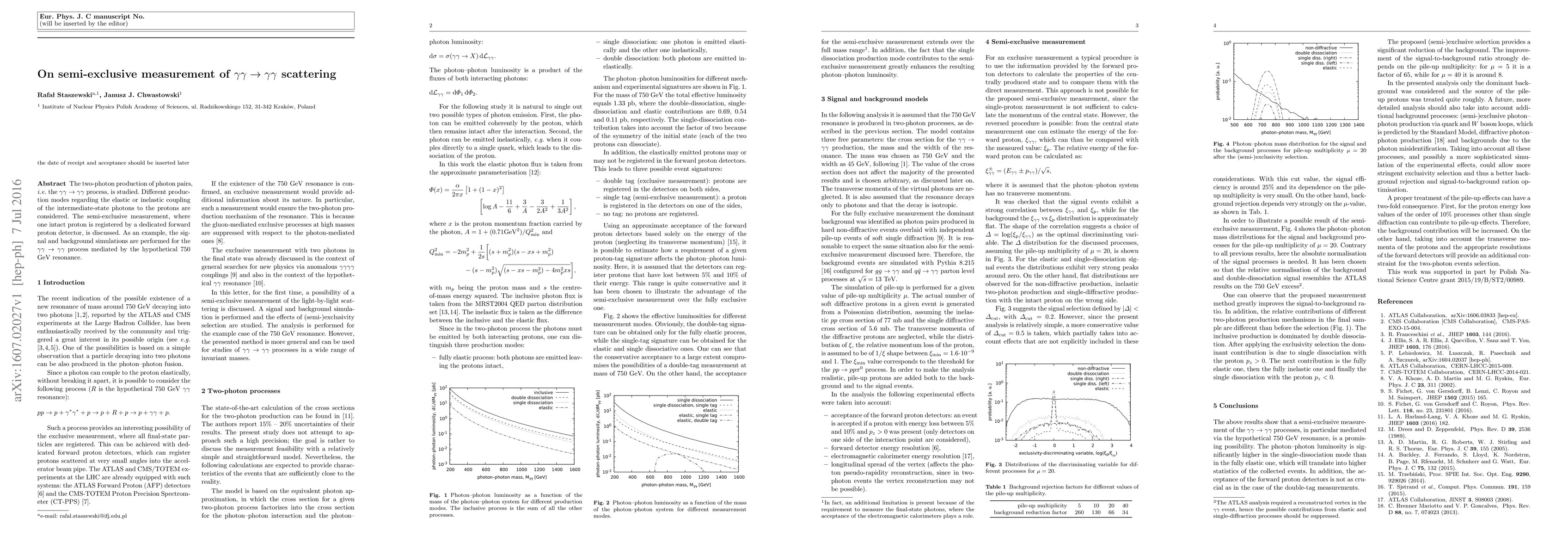 Researchers studied the production of two photon pairs in proton collisions, focusing on a semi-exclusive measurement that records one intact proton. They simulated signals and backgrounds for a hypothetical 750 GeV resonance to understand this process better.