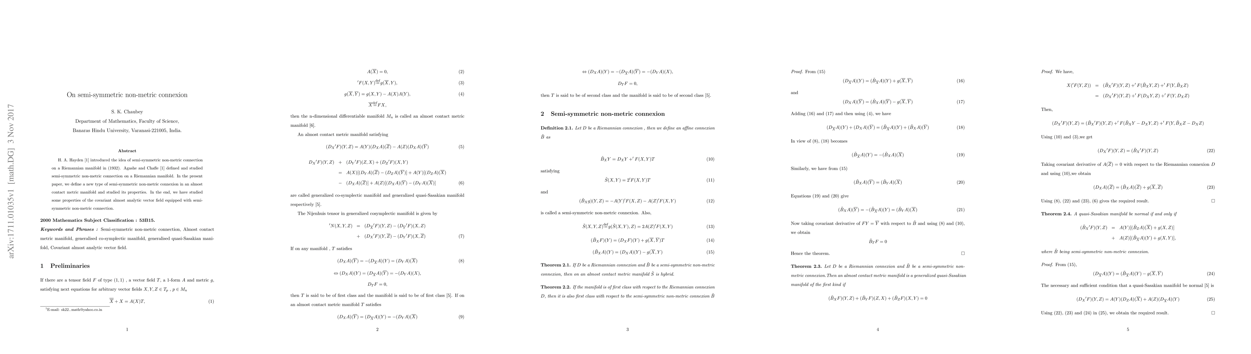 H. A. Hayden [1] introduced the idea of semi-symmetric non-metric connection on a Riemannian manifold in (1932). Agashe and Chafle \cite{1} defined and studied semi-symmetric non-metric connection on a Riemannian manifold. In the present paper, we define a new type of semi-symmetric non-metric connexion in an almost contact metric manifold and studied its properties. In the end, we have studied some properties of the covariant almost analytic vector field equipped with semi-symmetric non-metric connection.