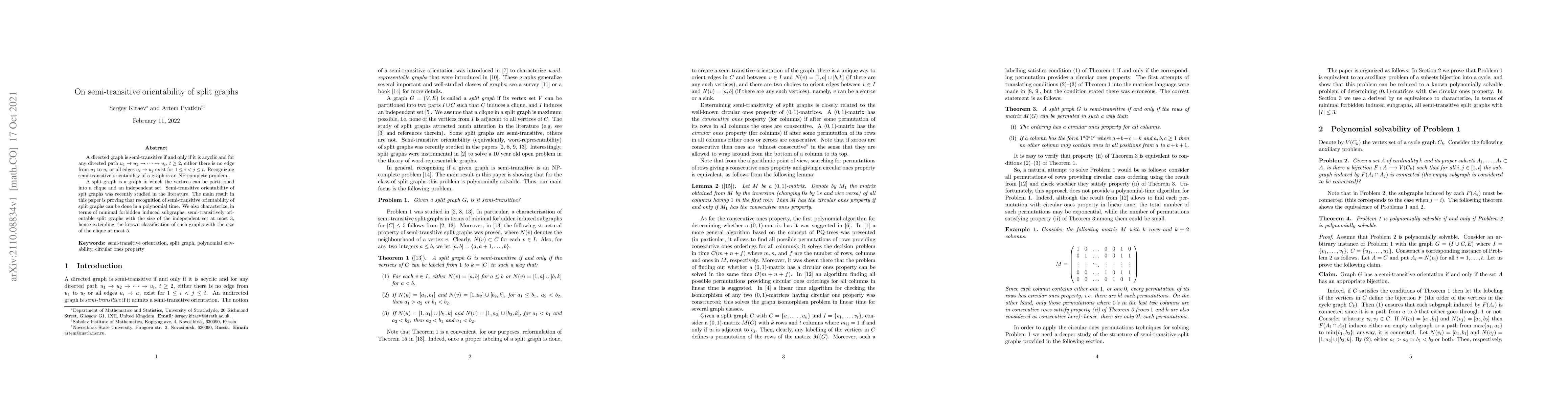 A directed graph is semi-transitive if and only if it is acyclic and for any directed path $u_1\rightarrow u_2\rightarrow \cdots \rightarrow u_t$, $t \geq 2$, either there is no edge from $u_1$ to $u_t$ or all edges $u_i\rightarrow u_j$ exist for $1 \leq i < j \leq t$. Recognizing semi-transitive orientability of a graph is an NP-complete problem. A split graph is a graph in which the vertices can be partitioned into a clique and an independent set. Semi-transitive orientability of spit graphs was recently studied in the literature. The main result in this paper is proving that recognition of semi-transitive orientability of split graphs can be done in a polynomial time. We also characterize, in terms of minimal forbidden induced subgraphs, semi-transitively orientable split graphs with the size of the independent set at most 3, hence extending the known classification of such graphs with the size of the clique at most 5.