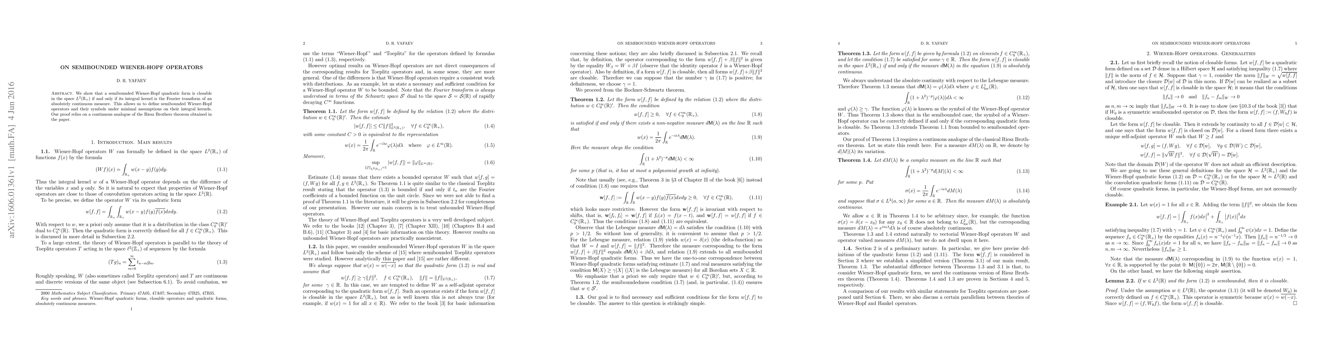 We show that a semibounded Wiener-Hopf quadratic form is closable in the space $L^2({\Bbb R}_{+})$ if and only if its integral kernel is the Fourier transform of an absolutely continuous measure. This allows us to define semibounded Wiener-Hopf operators and their symbols under minimal assumptions on their integral kernels. Our proof relies on a continuous analogue of the Riesz Brothers theorem obtained in the paper.