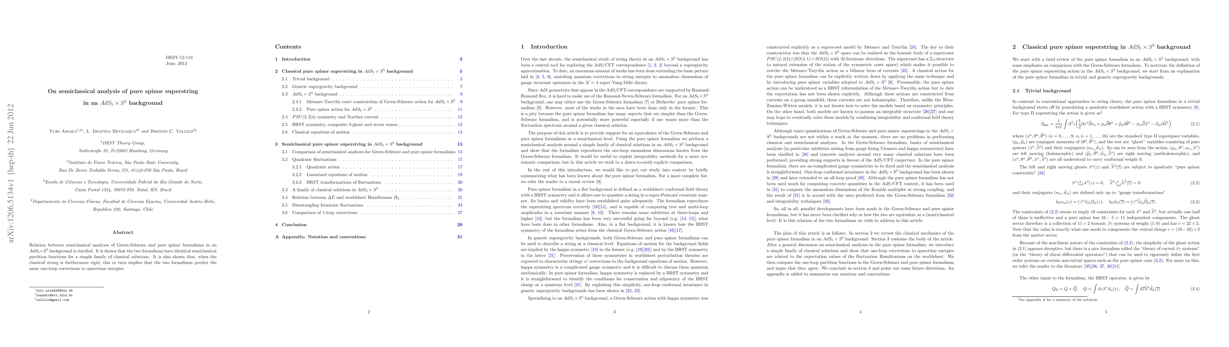 This paper clarifies the equivalence between semiclassical analyses of Green-Schwarz and pure spinor formalisms for pure spinor superstring in an AdS_5 x S^5 background, demonstrating identical semiclassical partition functions and one-loop corrections for a specific set of classical solutions.