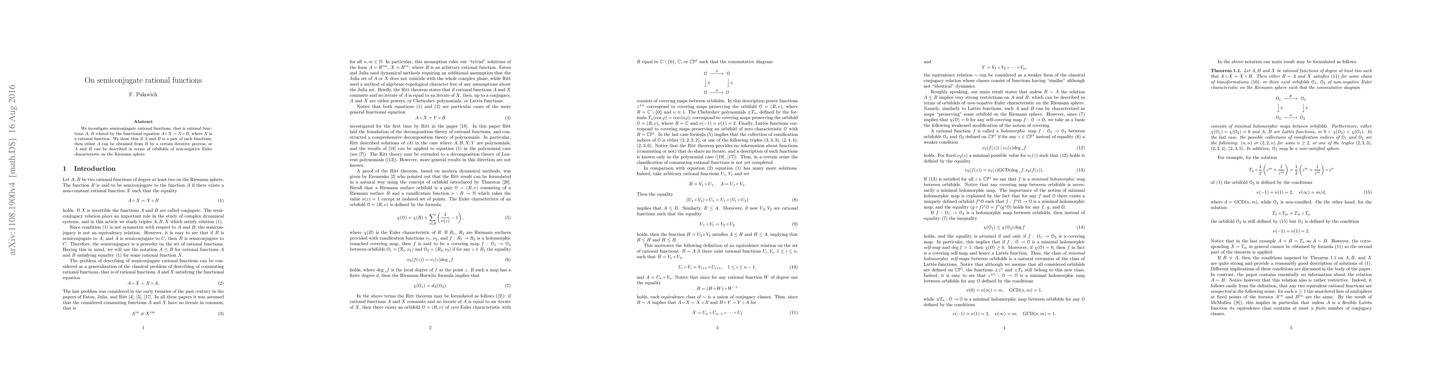 We investigate semiconjugate rational functions, that is rational functions $A,$ $B$ related by the functional equation $A\circ X=X\circ B$, where $X$ is a rational function of degree at least two. We show that if $A$ and $B$ is a pair of such functions, then either $B$ can be obtained from $A$ by a certain iterative process, or $A$ and $B$ can be described in terms of orbifolds of non-negative Euler characteristic on the Riemann sphere.