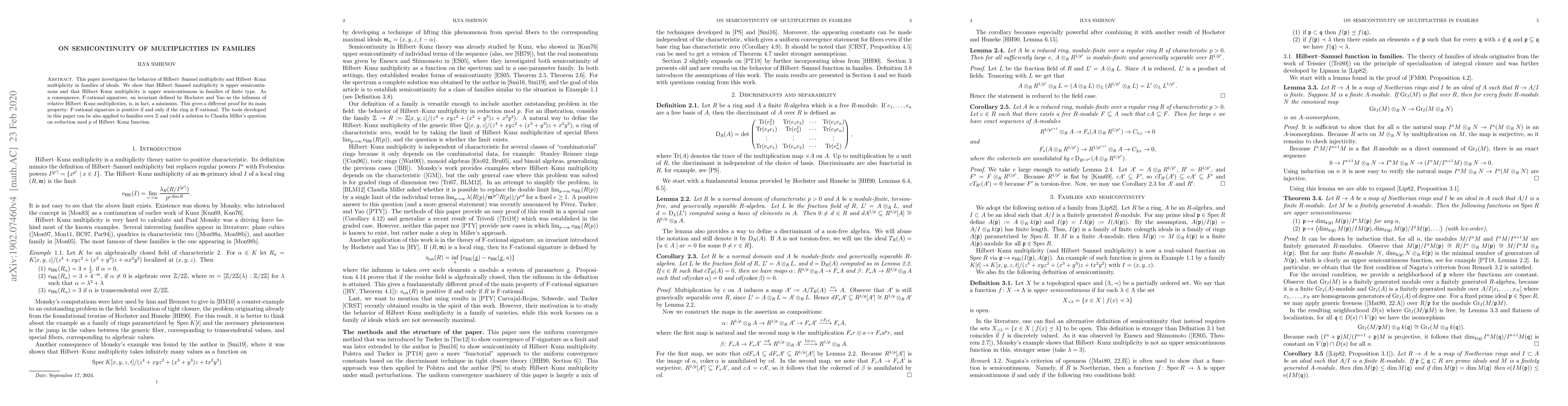 This research proves upper semicontinuity of Hilbert-Samuel and Hilbert-Kunz multiplicities in families of ideals, with applications to resolving questions on Hilbert-Kunz multiplicity in characteristic zero and attainment of the infimum in F-rational signature definition for affine rings.