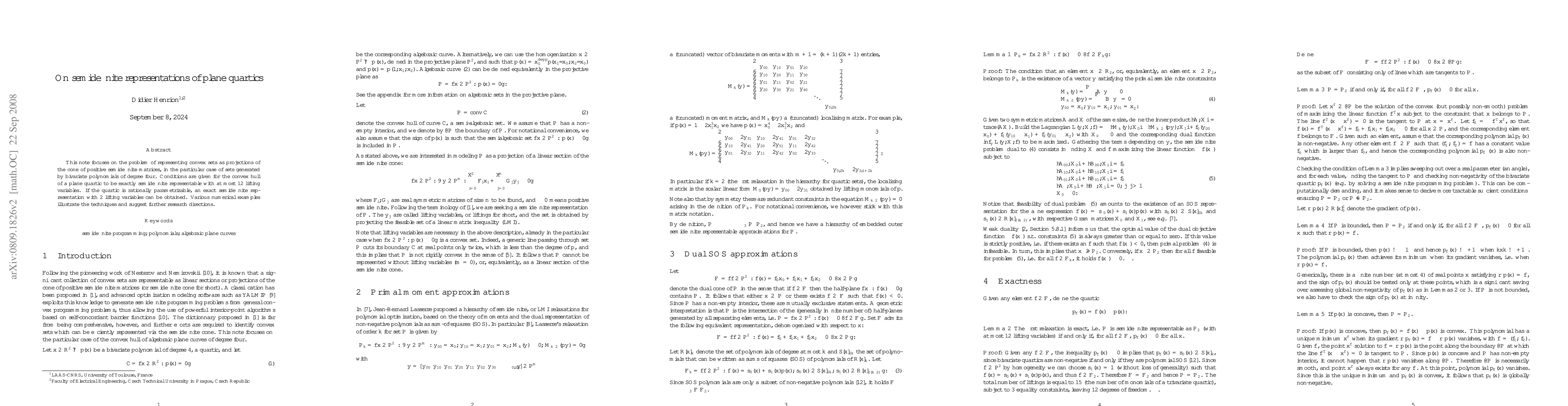 This paper investigates semidefinite representations for convex sets defined by plane quartics, providing conditions for their exact representation using positive semidefinite matrices and a minimal number of lifting variables. It also demonstrates that rationally parametrizable quartics can be represented with just two lifting variables.
