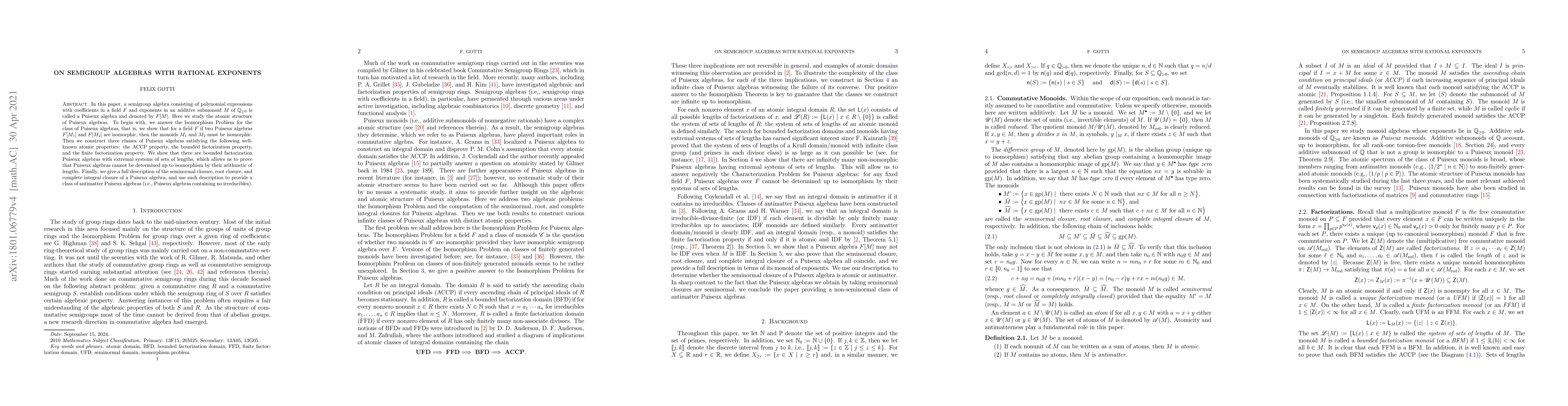 In this paper, a semigroup algebra consisting of polynomial expressions with coefficients in a field $F$ and exponents in an additive submonoid $M$ of $\mathbb{Q}_{\ge 0}$ is called a Puiseux algebra and denoted by $F[M]$. Here we study the atomic structure of Puiseux algebras. To begin with, we answer the Isomorphism Problem for the class of Puiseux algebras, that is, we show that for a field $F$ if two Puiseux algebras $F[M_1]$ and $F[M_2]$ are isomorphic, then the monoids $M_1$ and $M_2$ must be isomorphic. Then we construct three classes of Puiseux algebras satisfying the following well-known atomic properties: the ACCP property, the bounded factorization property, and the finite factorization property. We show that there are bounded factorization Puiseux algebras with extremal systems of sets of lengths, which allows us to prove that Puiseux algebras cannot be determined up to isomorphism by their arithmetic of lengths. Finally, we give a full description of the seminormal closure, root closure, and complete integral closure of a Puiseux algebra, and use such description to provide a class of antimatter Puiseux algebras (i.e., Puiseux algebras containing no irreducibles).