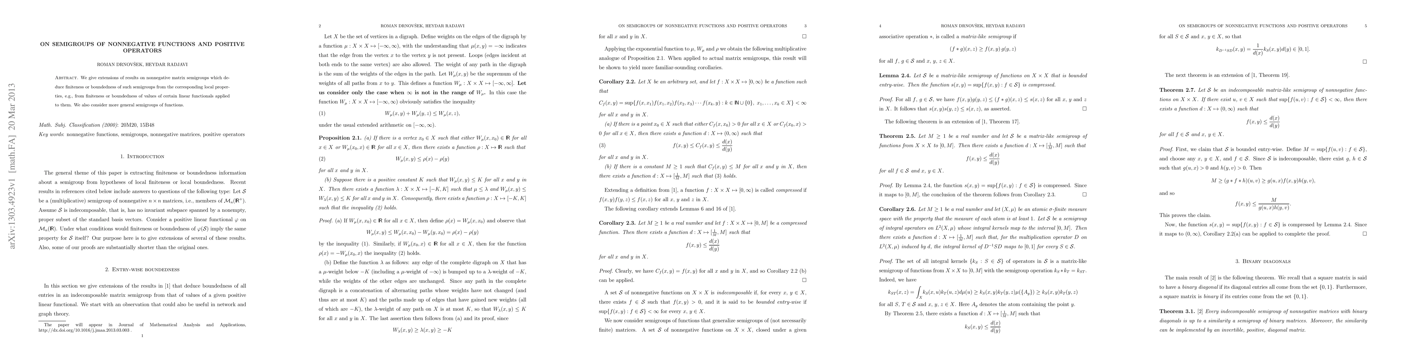 This paper extends results on nonnegative matrix semigroups, showing that finiteness or boundedness of these semigroups can be inferred from local properties, such as finiteness or boundedness of specific linear functionals. It also explores more general semigroups of nonnegative functions.