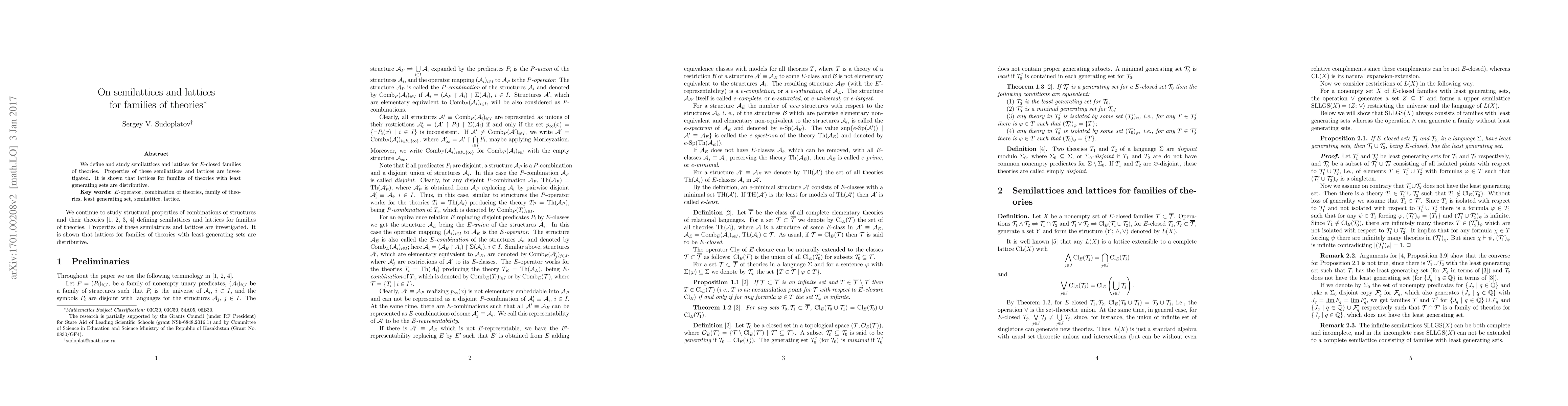 This paper defines and examines semilattices and lattices for $E$-closed families of theories, revealing that lattices with least generating sets exhibit distributive properties. The study focuses on the structural properties of these algebraic constructs.