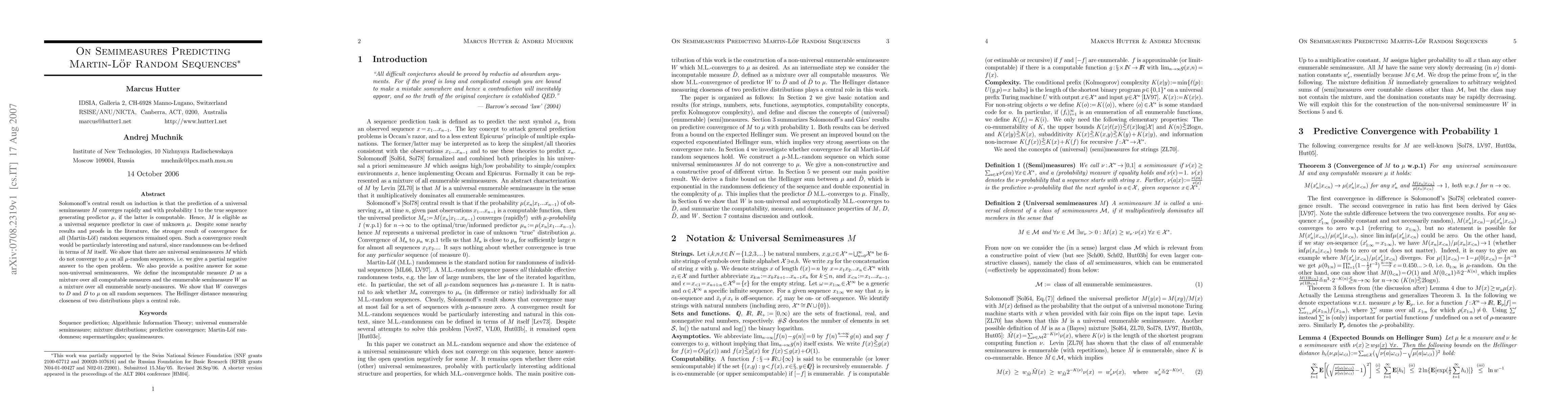 This paper demonstrates that universal semimeasures do not always predict Martin-Loef random sequences, providing a partial negative answer to an open problem. However, it shows that certain non-universal semimeasures, like the enumerable semimeasure W, do converge to the incomputable measure D on all random sequences, using the Hellinger distance for analysis.