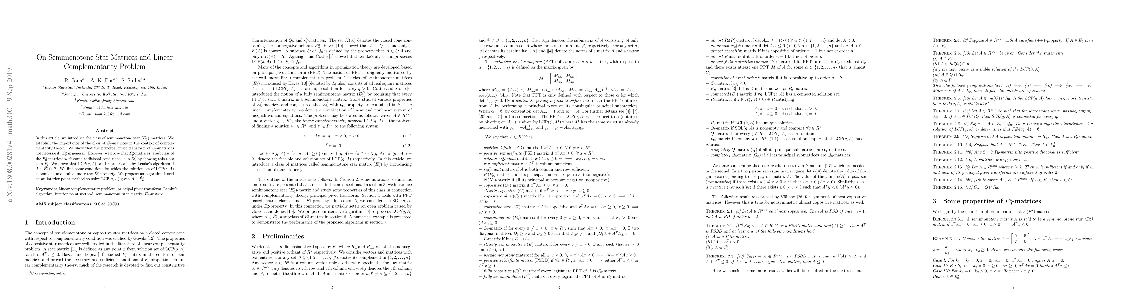 In this article, we introduce the class of semimonotone star ($E_0^s$) matrices. We establish the importance of the class of $E_0^s$-matrices in the context of complementarity theory. We show that the principal pivot transform of $E_0^s$-matrix is not necessarily $E_0^s$ in general. However, we prove that $\tilde{E_0^s}$-matrices, a subclass of the $E_0^s$-matrices with some additional conditions, is in $E_0^f$ by showing this class is in $P_0.$ We prove that LCP$(q, A)$ can be processable by Lemke's algorithm if $A\in \tilde{E_0^s}\cap P_0.$ We find some conditions for which the solution set of LCP$(q, A)$ is bounded and stable under the $\tilde{E^s_0}$-property. We propose an algorithm based on an interior point method to solve LCP$(q, A)$ given $A \in \tilde{E^{s}_{0}}.$