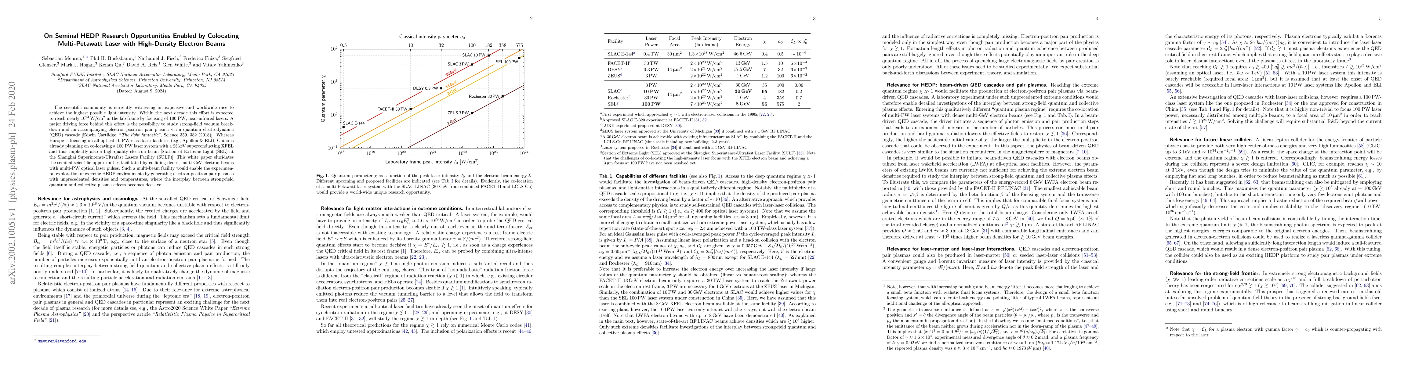 The scientific community is currently witnessing an expensive and worldwide race to achieve the highest possible light intensity. Within the next decade this effort is expected to reach nearly $10^{24}\,\mathrm{W}/\mathrm{cm^2}$ in the lab frame by focusing of 100 PW, near-infrared lasers. A major driving force behind this effort is the possibility to study strong-field vacuum breakdown and an accompanying electron-positron pair plasma via a quantum electrodynamic (QED) cascade [Edwin Cartlidge, "The light fantastic", Science 359, 382 (2018)]. Whereas Europe is focusing on all-optical 10 PW-class laser facilities (e.g., Apollon and ELI), China is already planning on co-locating a 100 PW laser system with a 25 keV superconducting XFEL and thus implicitly also a high-quality electron beam [Station of Extreme Light (SEL) at the Shanghai Superintense-Ultrafast Lasers Facility (SULF)]. This white paper elucidates the seminal scientific opportunities facilitated by colliding dense, multi-GeV electron beams with multi-PW optical laser pulses. Such a multi-beam facility would enable the experimental exploration of extreme HEDP environments by generating electron-positron pair plasmas with unprecedented densities and temperatures, where the interplay between strong-field quantum and collective plasma effects becomes decisive.