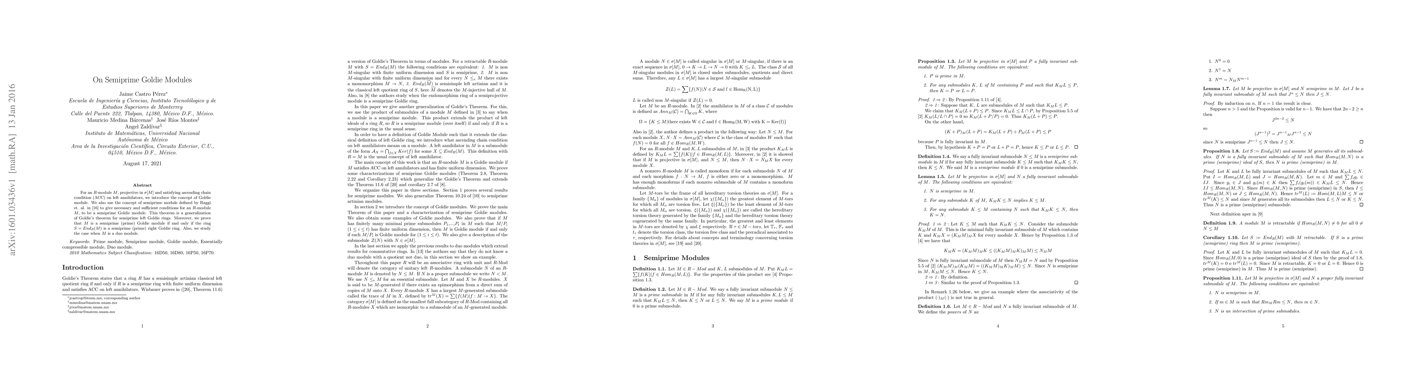 This paper introduces the concept of Goldie modules for $R$-modules that are projective in $\sigma[M]$ and satisfy the ascending chain condition on left annihilators. It provides necessary and sufficient conditions for an $R$-module to be a semiprime Goldie module, generalizing Goldie's theorem for semiprime left Goldie rings. Additionally, it establishes equivalences between $M$ being a semiprime (prime) Goldie module and $S=End_R(M)$ being a semiprime (prime) right Goldie ring, and explores the case when $M$ is a duo module.