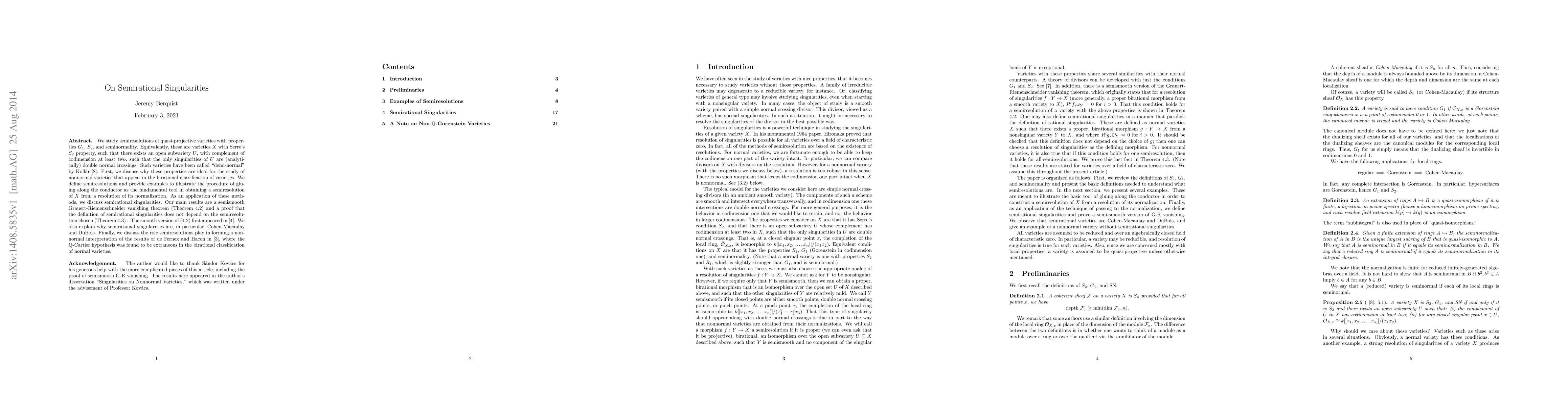 We study semiresolutions of quasi-projective varieties with properties $G_1$, $S_2$, and seminormality. Equivalently, these are varieties $X$ with Serre's $S_2$ property, such that there exists an open subvariety $U$, with complement of codimension at least two, such that the only singularities of $U$ are (analytically) double normal crossings. Such varieties have been called "demi-normal" by Koll\'ar \cite{Kol13}. First, we discuss why these properties are ideal for the study of nonnormal varieties that appear in the birational classification of varieties. We define semiresolutions and provide examples to illustrate the procedure of gluing along the conductor as the fundamental tool in obtaining a semiresolution of $X$ from a resolution of its normalization. As an application of these methods, we discuss semirational singularities. Our main results are a semismooth Grauert-Riemenschneider vanishing theorem (Theorem 4.2) and a proof that the definition of semirational singularities does not depend on the semiresolution chosen (Theorem 4.3) . The smooth version of (4.2) first appeared in \cite{GR70}. We also explain why semirational singularities are, in particular, Cohen-Macaulay and DuBois. Finally, we discuss the role semiresolutions play in forming a nonnormal interpretation of the results of de Fernex and Hacon in \cite{dFH09}, where the $\mathbb{Q}$-Cartier hypothesis was found to be extraneous in the birational classification of normal varieties.