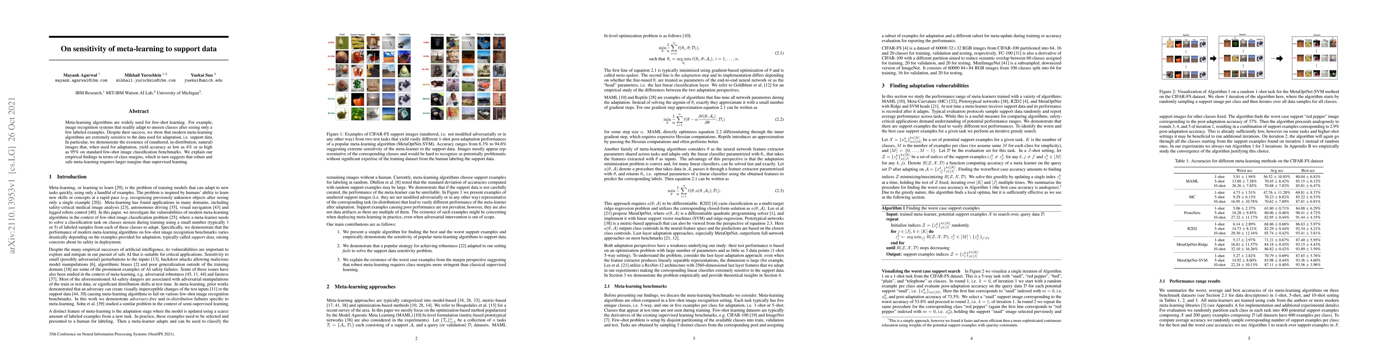 Meta-learning algorithms are widely used for few-shot learning. For example, image recognition systems that readily adapt to unseen classes after seeing only a few labeled examples. Despite their success, we show that modern meta-learning algorithms are extremely sensitive to the data used for adaptation, i.e. support data. In particular, we demonstrate the existence of (unaltered, in-distribution, natural) images that, when used for adaptation, yield accuracy as low as 4\% or as high as 95\% on standard few-shot image classification benchmarks. We explain our empirical findings in terms of class margins, which in turn suggests that robust and safe meta-learning requires larger margins than supervised learning.
