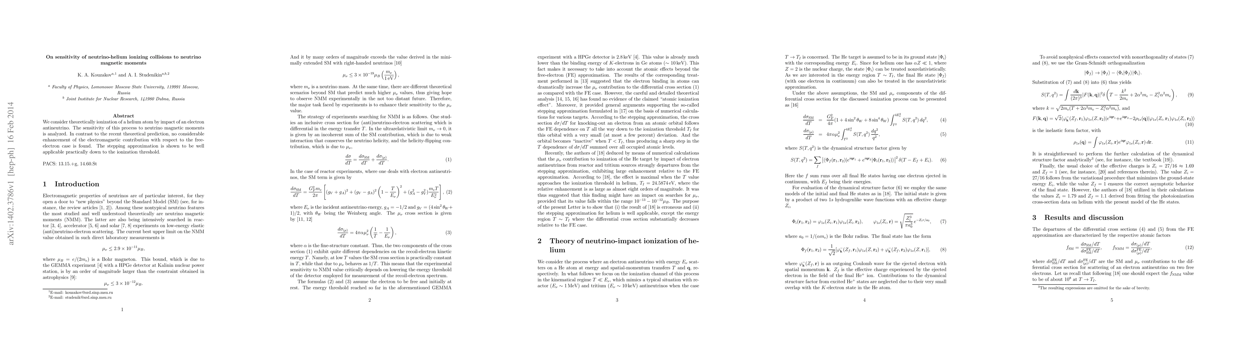 We consider theoretically ionization of a helium atom by impact of an electron antineutrino. The sensitivity of this process to neutrino magnetic moments is analyzed. In contrast to the recent theoretical prediction, no considerable enhancement of the electromagnetic contribution with respect to the free-electron case is found. The stepping approximation is shown to be well applicable practically down to the ionization threshold.