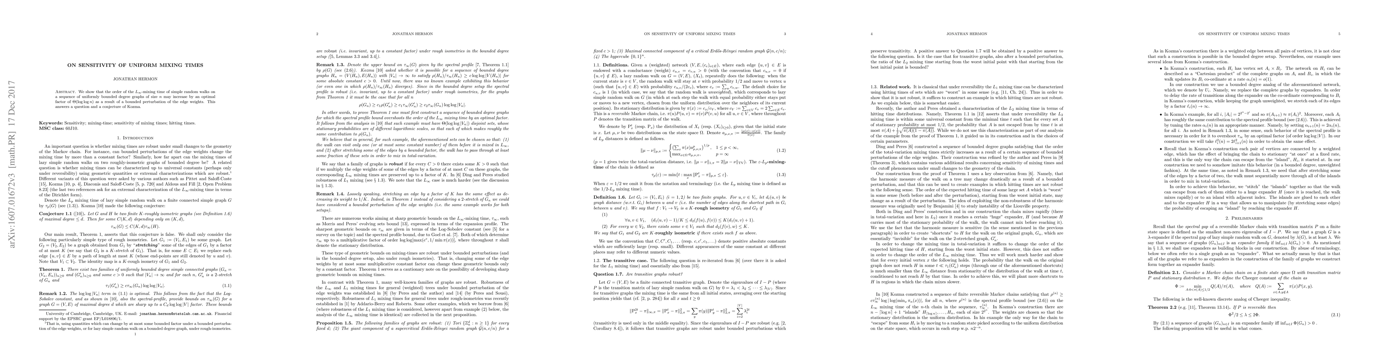 This work answers a question and a conjecture of Kozma, providing insights into the sensitivity of uniform mixing times in random walks on graphs, which has implications for understanding convergence rates in Markov chains and random processes.