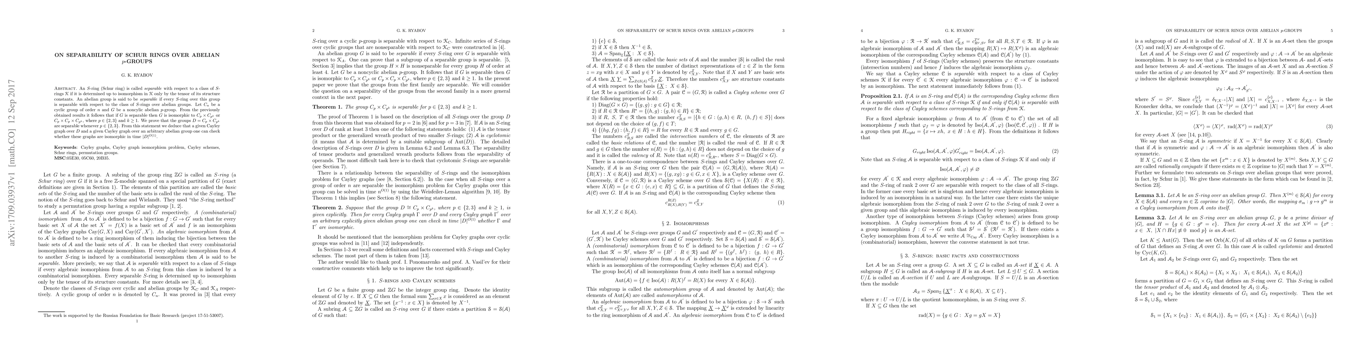 This paper investigates the separability of Schur rings over abelian $p$-groups, proving that certain groups like $C_p \times C_{p^k}$ are separable when $p \in \{2,3\}$. It concludes by demonstrating that isomorphism between Cayley graphs over these groups and arbitrary abelian groups can be checked in time $|D|^{O(1)}$.