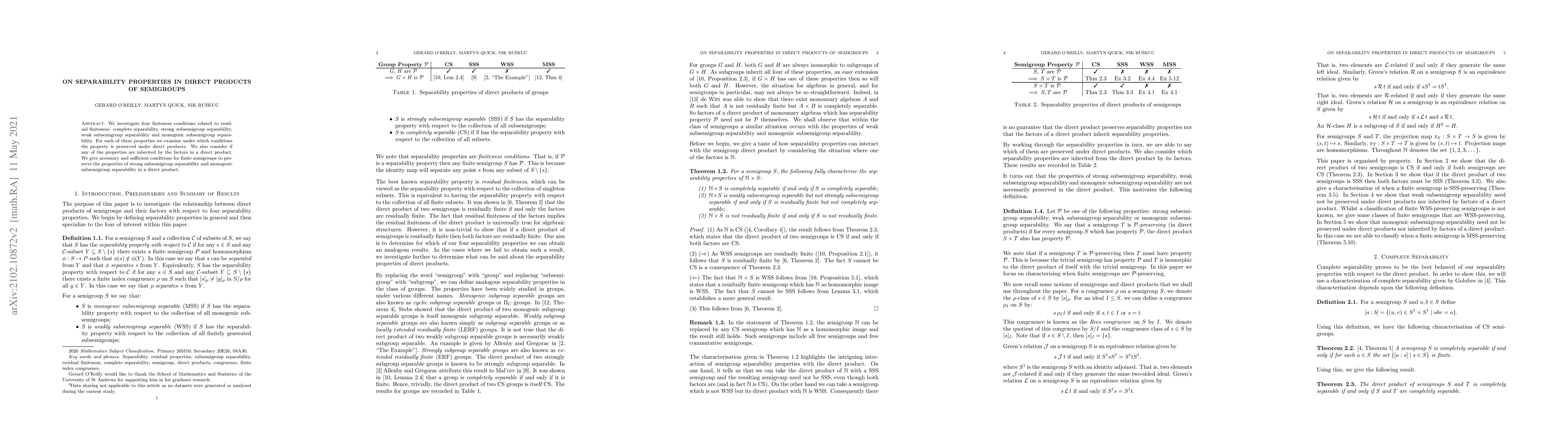 We investigate four finiteness conditions related to residual finiteness: complete separability, strong subsemigroup separability, weak subsemigroup separability and monogenic subsemigroup separability. For each of these properties we examine under which conditions the property is preserved under direct products. We also consider if any of the properties are inherited by the factors in a direct product. We give necessary and sufficient conditions for finite semigroups to preserve the properties of strong subsemigroup separability and monogenic subsemigroup separability in a direct product.