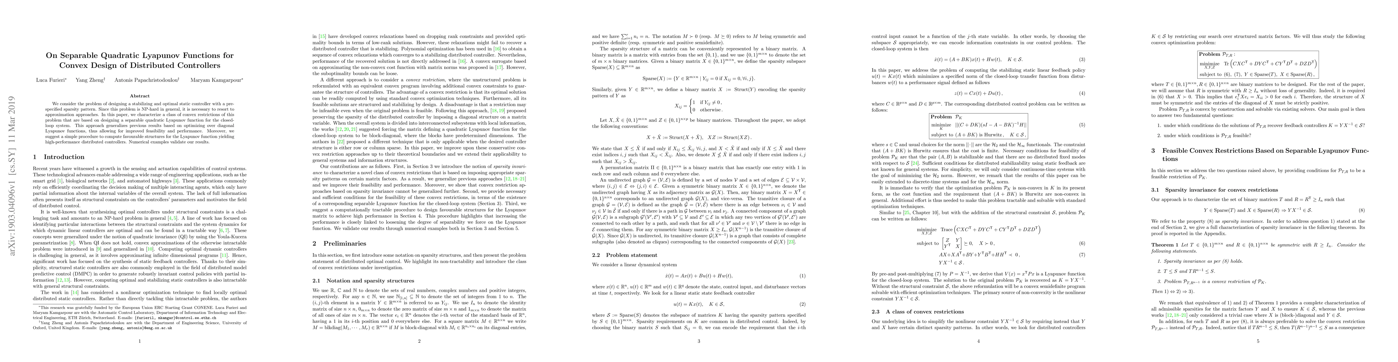This paper addresses the NP-hard problem of designing optimal, sparse static controllers by leveraging convex restrictions based on separable quadratic Lyapunov functions. This method enhances feasibility and performance over previous diagonal-based approaches, and a simple procedure is proposed to compute optimal Lyapunov structures for high-performance distributed controllers, validated through numerical examples.