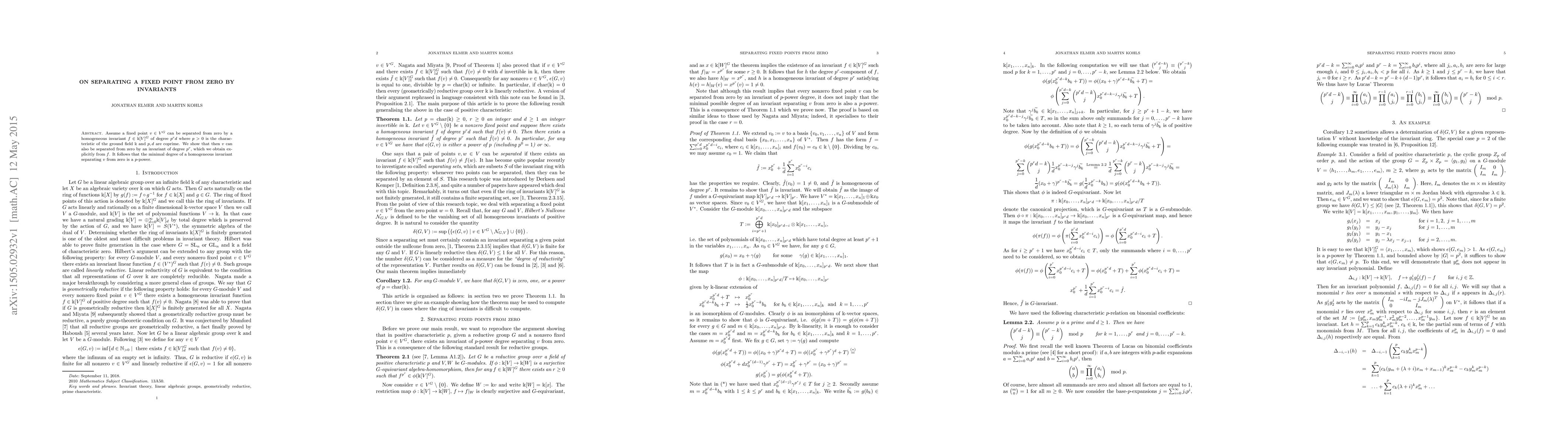 Assume a fixed point v in a G-module V can be separated from zero by a homogeneous invariant of degree dp^r where p>0 is the characteristic of the ground field k and p, d are coprime. We show that then v can also be separated from zero by an invariant of degree p^r , which we obtain explicitly from f. It follows that the minimal degree of a homogeneous invariant separating v from zero is a p-power.