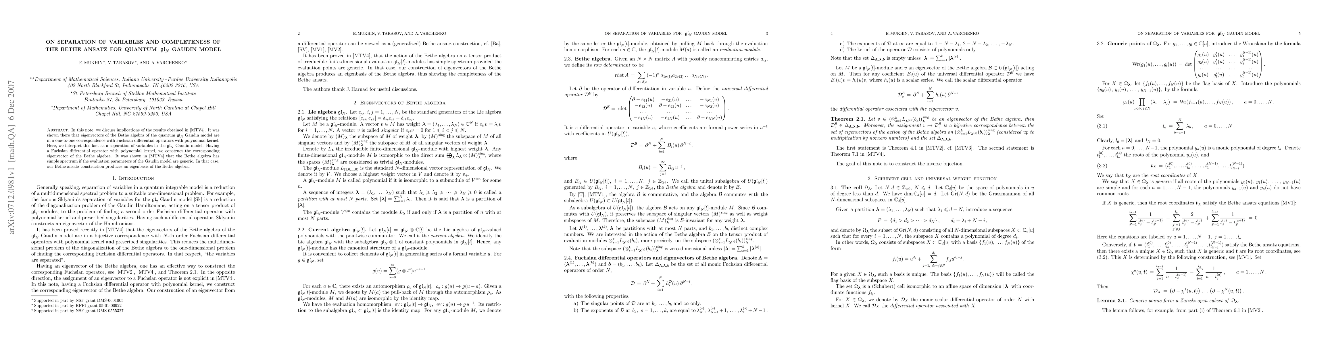 This paper discusses the implications of the results from [MTV4], showing that the eigenvectors of the Bethe algebra for the quantum gl_N Gaudin model correspond to Fuchsian differential operators with polynomial kernels, thus establishing a separation of variables. The authors construct these eigenvectors and demonstrate the completeness of the Bethe ansatz when the evaluation parameters are generic.