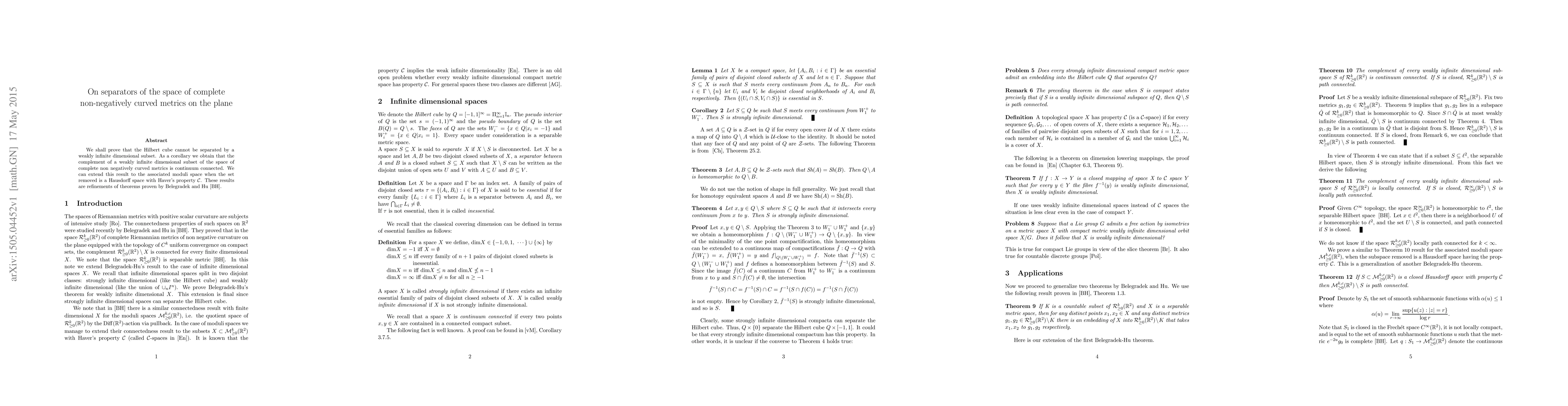 We shall prove that the Hilbert cube cannot be separated by a weakly infinite dimensional subset. As a corollary we obtain that the complement of a weakly infinite dimensional subset of the space of complete non negatively curved metrics is continuum connected. We can extend this result to the associated moduli space when the set removed is a Hausdorff space with Haver's property C. These results are refinements of theorems proven by Belegradek and Hu.