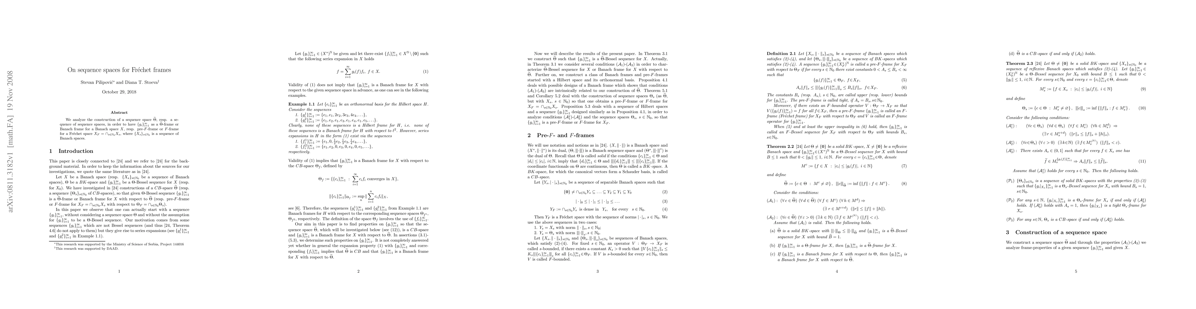 We analyze the construction of a sequence space $\widetilde{\Theta}$, resp. a sequence of sequence spaces, in order to have $\{g_i\}$ as a $\widetilde{\Theta}$-frame or Banach frame for a Banach space $X$, resp. pre-$F$-frame or $F$-frame for a Fr\'echet space $X_F=\cap_{s\in {\mathbb N}_0} X_s$, where $\{X_s\}_{s\in {\mathbb N}_0}$ is a sequence of Banach spaces.
