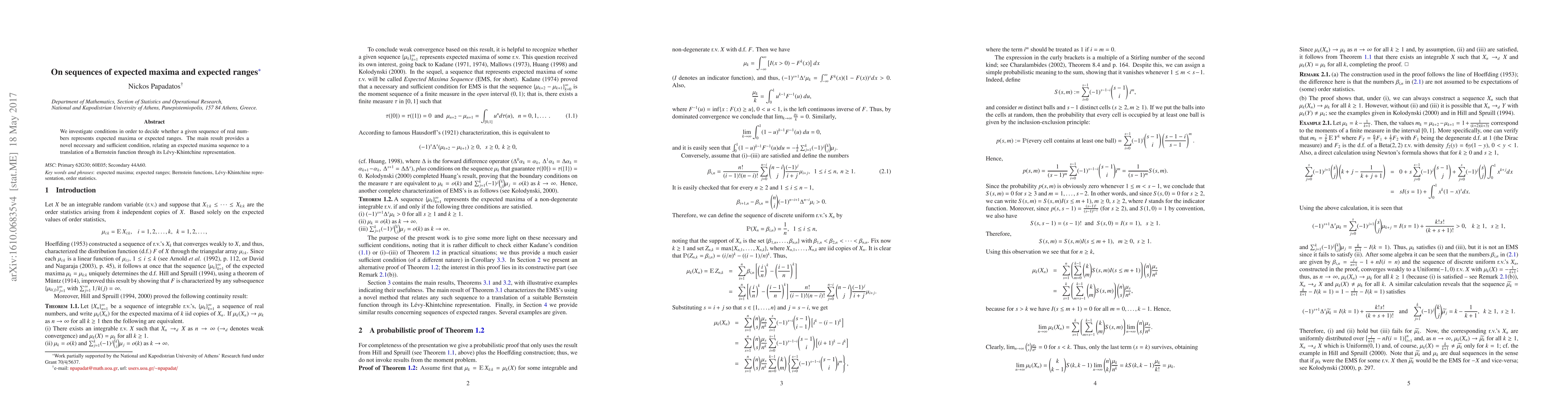 We investigate conditions in order to decide whether a given sequence of real numbers represents expected maxima or expected ranges. The main result provides a novel necessary and sufficient condition, relating an expected maxima sequence to a translation of a Bernstein function through its L\'{e}vy-Khintchine representation. Key words and phrases: expected maxima; expected ranges; Bernstein functions, L\'{e}vy-Khintchine representation, order statistics.