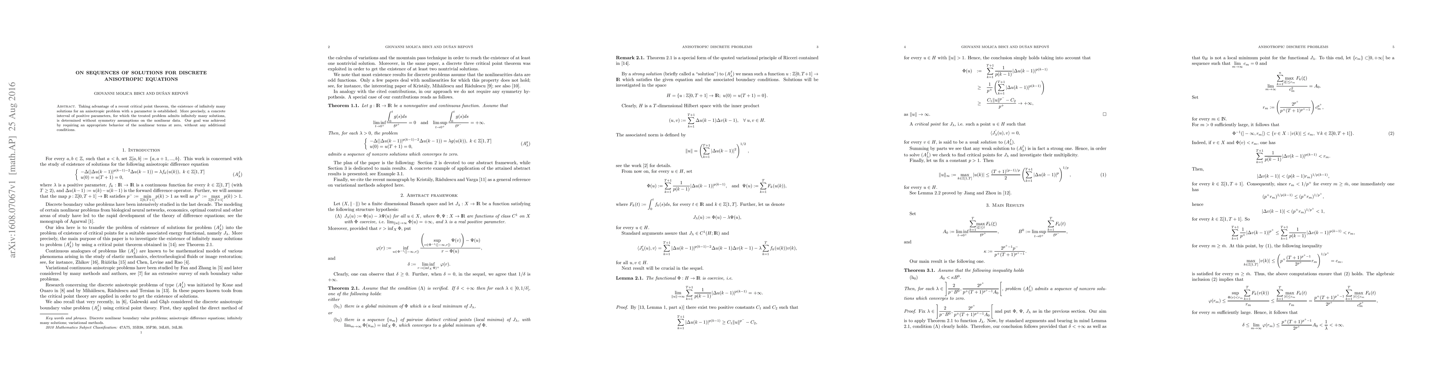 Taking advantage of a recent critical point theorem, the existence of infinitely many solutions for an anisotropic problem with a parameter is established. More precisely, a concrete interval of positive parameters, for which the treated problem admits infinitely many solutions, is determined without symmetry assumptions on the nonlinear data. Our goal was achieved by requiring an appropriate behavior of the nonlinear terms at zero, without any additional conditions.