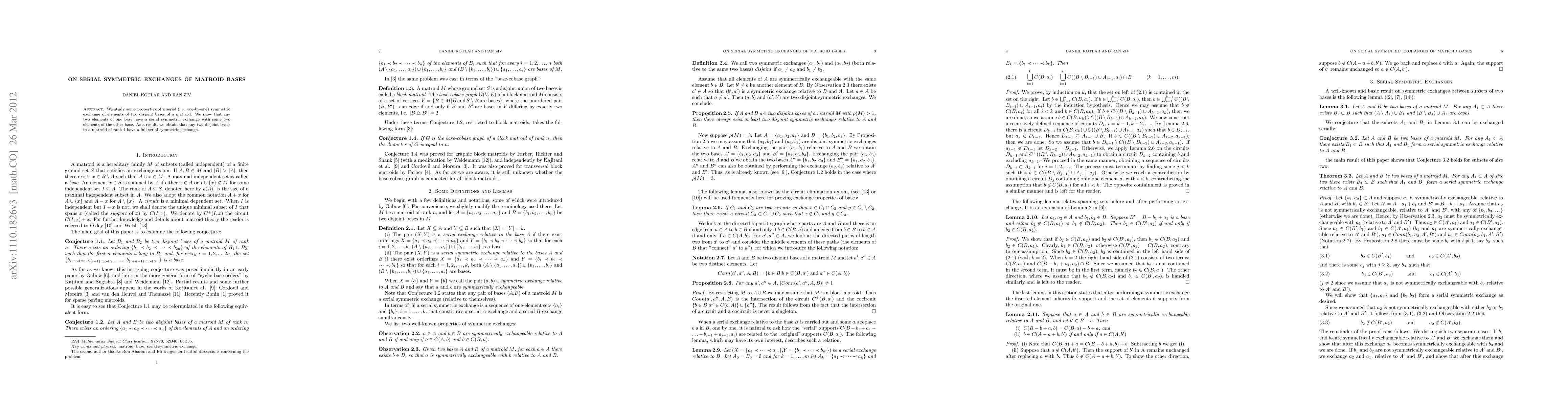 We study some properties of a serial (i.e. one-by-one) symmetric exchange of elements of two disjoint bases of a matroid. We show that any two elements of one base have a serial symmetric exchange with some two elements of the other base. As a result, we obtain that any two disjoint bases in a matroid of rank 4 have a full serial symmetric exchange.