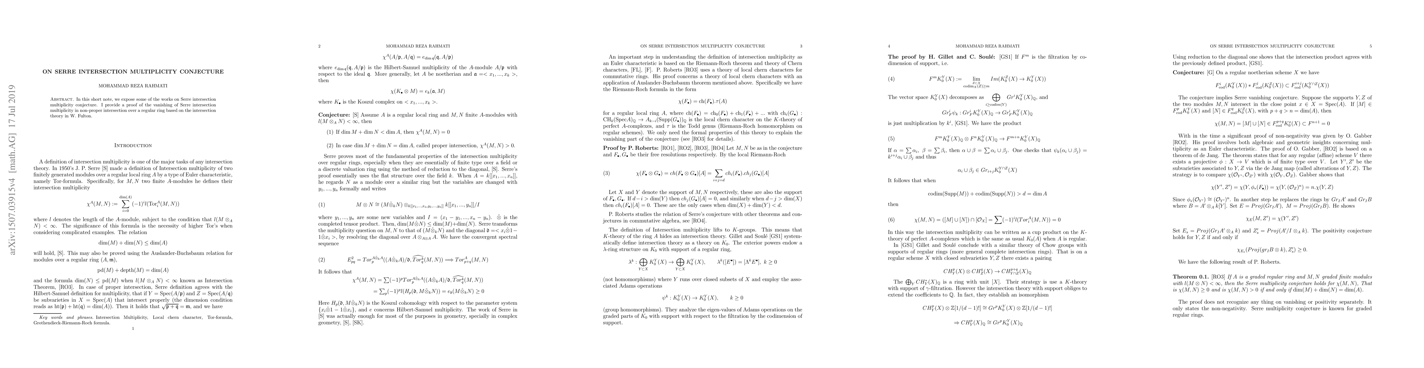 In this short note, we expose some of the works on Serre intersection multiplicity conjecture. I provide a proof of the vanishing of Serre intersection multiplicity in non-proper intersection over a regular ring based on the intersection theory in W. Fulton.