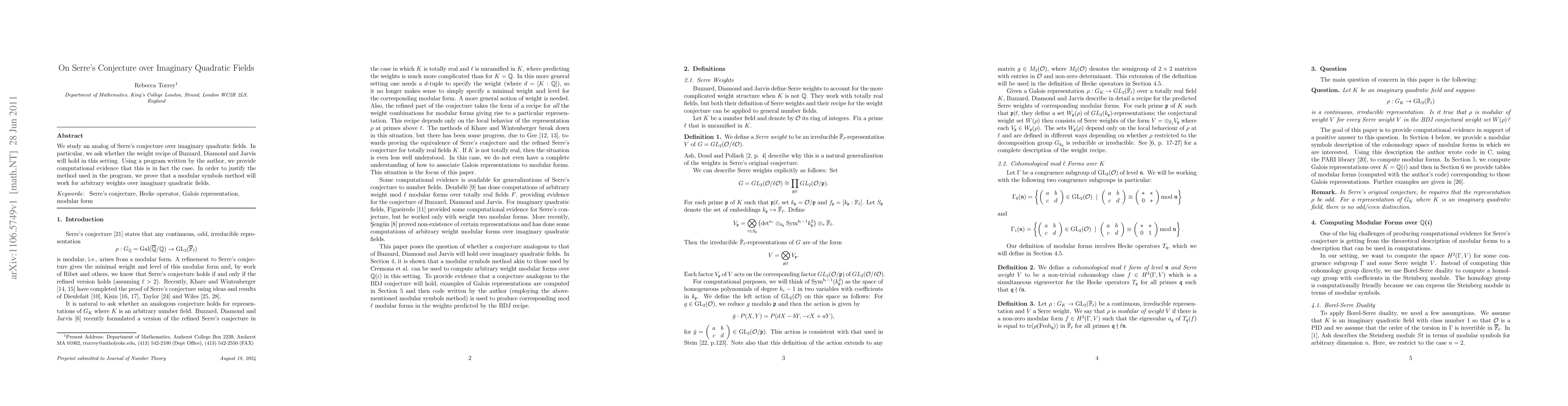 This paper investigates the validity of Serre's conjecture in the context of imaginary quadratic fields, confirming through computational evidence that the weight recipe of Buzzard, Diamond, and Jarvis holds. The authors also prove that a modular symbols method is applicable for any weight in this setting.