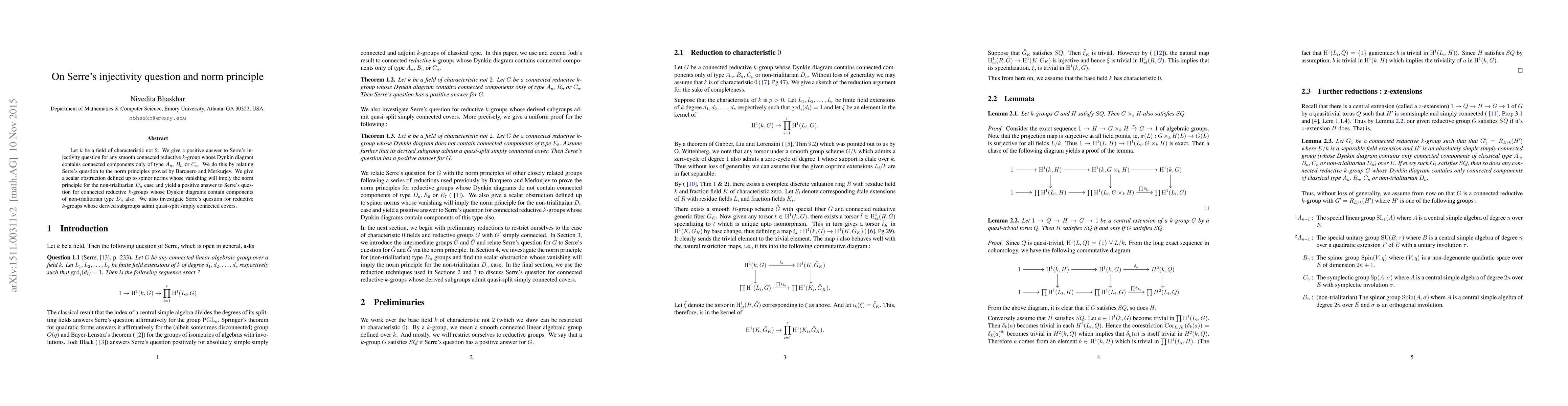 Let $k$ be a field of characteristic not $2$. We give a positive answer to Serre's injectivity question for any smooth connected reductive $k$-group whose Dynkin diagram contains connected components only of type $A_n$, $B_n$ or $C_n$. We do this by relating Serre's question to the norm principles proved by Barquero and Merkurjev. We give a scalar obstruction defined up to spinor norms whose vanishing will imply the norm principle for the non-trialitarian $D_{n}$ case and yield a positive answer to Serre's question for connected reductive $k$-groups whose Dynkin diagrams contain components of non-trialitarian type $D_n$ also. We also investigate Serre's question for reductive $k$-groups whose derived subgroups admit quasi-split simply connected covers.