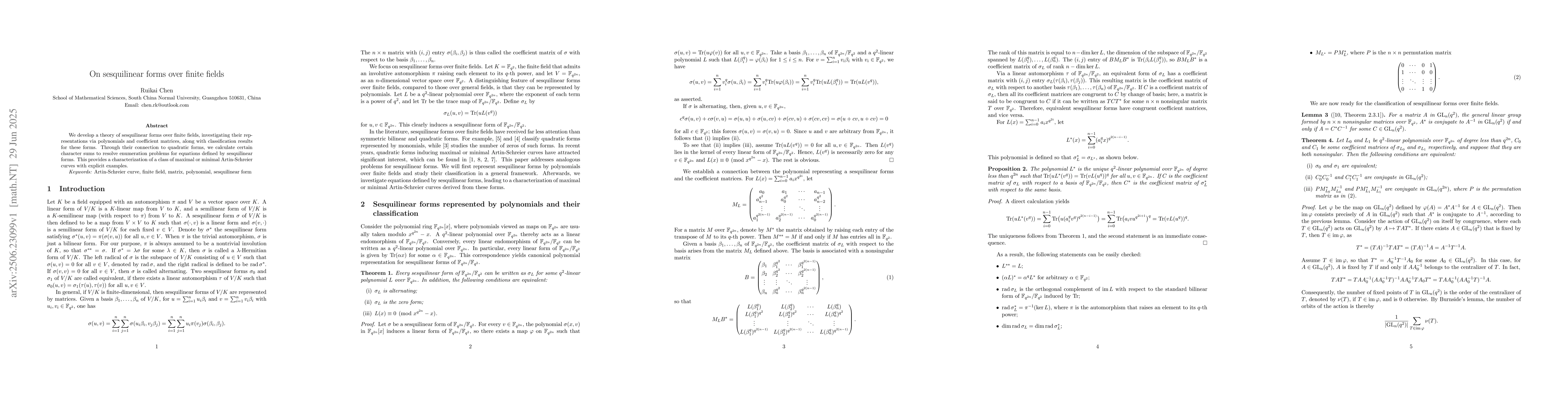 We develop a theory of sesquilinear forms over finite fields, investigating their representations via polynomials and coefficient matrices, along with classification results for these forms. Through their connection to quadratic forms, we calculate certain character sums to resolve enumeration problems for equations defined by sesquilinear forms. This provides a characterization of a class of maximal or minimal Artin-Schreier curves with explicit examples.