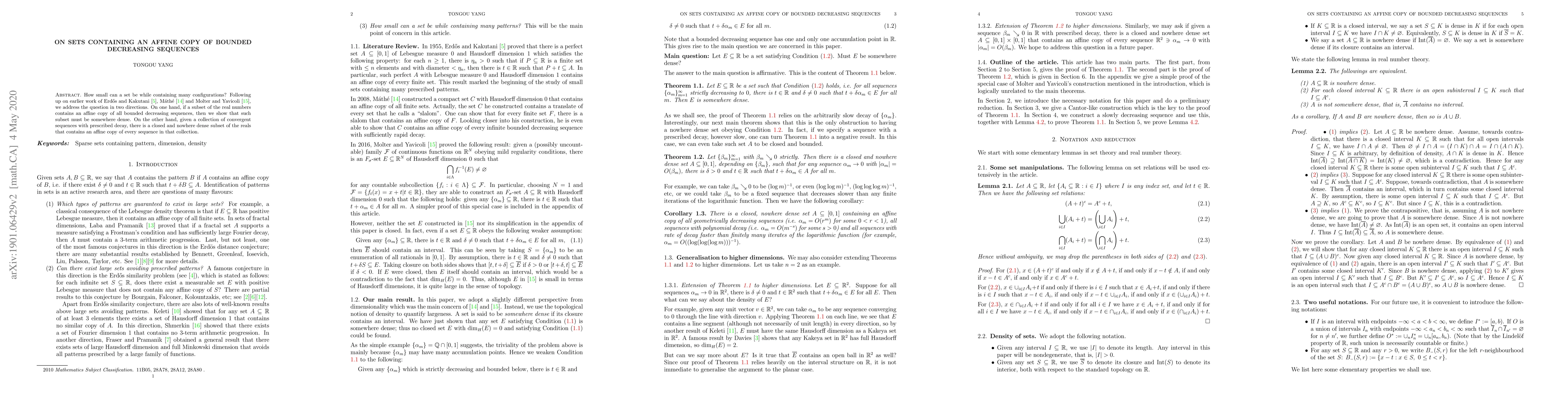 How small can a set be while containing many configurations? Following up on earlier work of Erd\H os and Kakutani \cite{MR0089886}, M\'ath\'e \cite{MR2822418} and Molter and Yavicoli \cite{Molter}, we address the question in two directions. On one hand, if a subset of the real numbers contains an affine copy of all bounded decreasing sequences, then we show that such subset must be somewhere dense. On the other hand, given a collection of convergent sequences with prescribed decay, there is a closed and nowhere dense subset of the reals that contains an affine copy of every sequence in that collection.