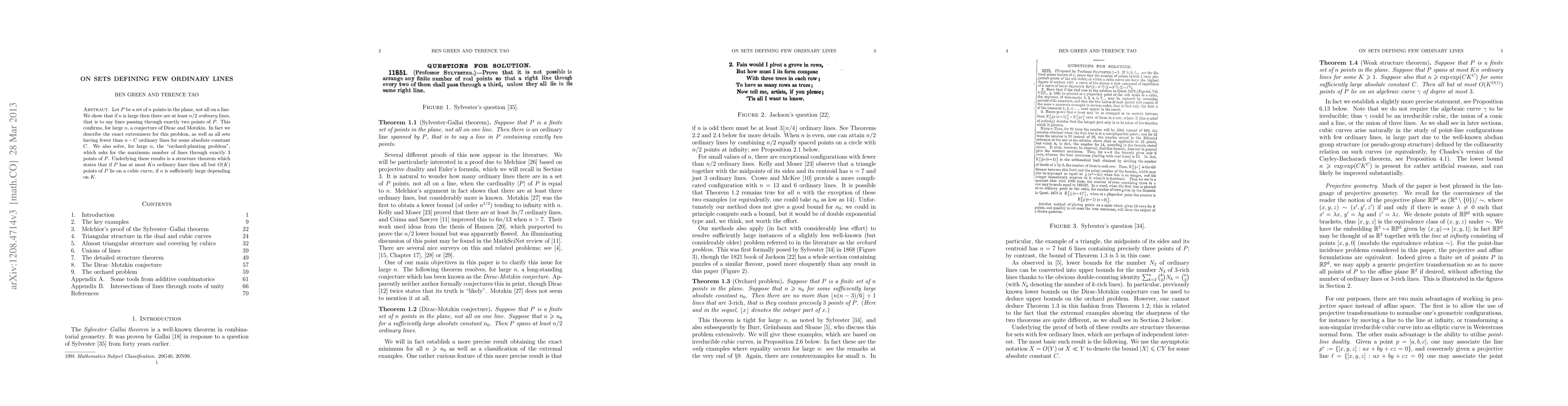 This paper proves that large sets of points in the plane, not all collinear, must define at least n/2 ordinary lines, confirming a conjecture by Dirac and Motzkin. It also identifies the exact configurations that minimize the number of such lines and solves the "orchard-planting problem" for large n.
