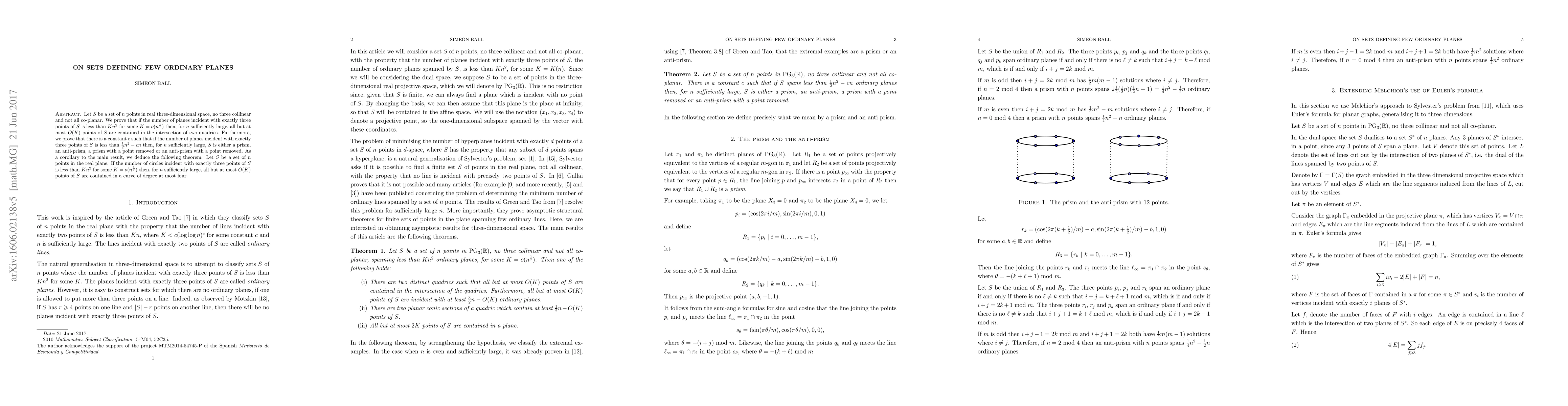 This paper proves that a set of $n$ points in 3D space with few ordinary planes is mostly contained in the intersection of two quadrics or specific geometric structures. It also extends the result to 2D, showing that a set of points with few circles is mostly contained in a degree four curve.