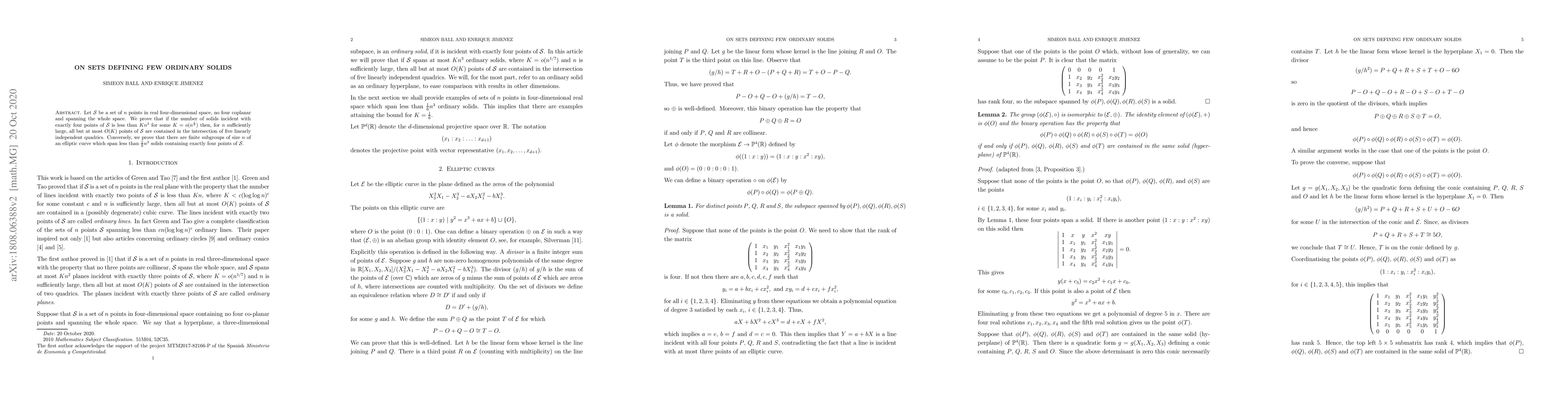 Let $\mathcal{S}$ be a set of $n$ points in real four-dimensional space, no four coplanar and spanning the whole space. We prove that if the number of solids incident with exactly four points of $\mathcal{S}$ is less than $Kn^3$ for some $K=o(n^{\frac{1}{7}})$ then, for $n$ sufficiently large, all but at most $O(K)$ points of $\mathcal{S}$ are contained in the intersection of five linearly independent quadrics. Conversely, we prove that there are finite subgroups of size $n$ of an elliptic curve which span less than $\frac{1}{6}n^3$ solids containing exactly four points of $\mathcal{S}$.
