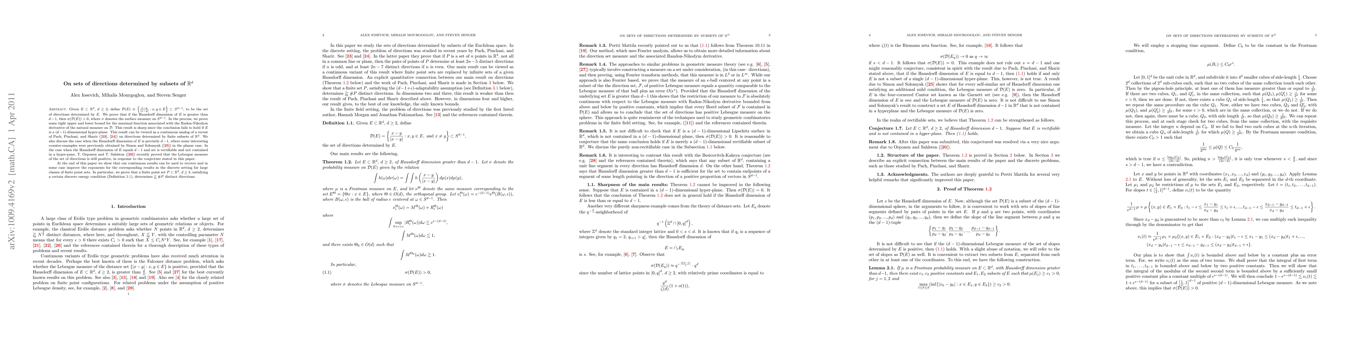 This paper investigates sets of directions determined by subsets of ${\Bbb R}^d$ and proves that if the Hausdorff dimension of $E$ exceeds $d-1$, then the set of directions ${\mathcal D}(E)$ has positive surface measure. It also shows that if the Hausdorff dimension of $E$ is greater than $(d-1)/2+1/3$, then the angle set ${\mathcal A}(E)$ has positive Lebesgue measure. The results are analogous to discrete results in the literature and can be used to improve discrete analogues for large classes of finite point sets.