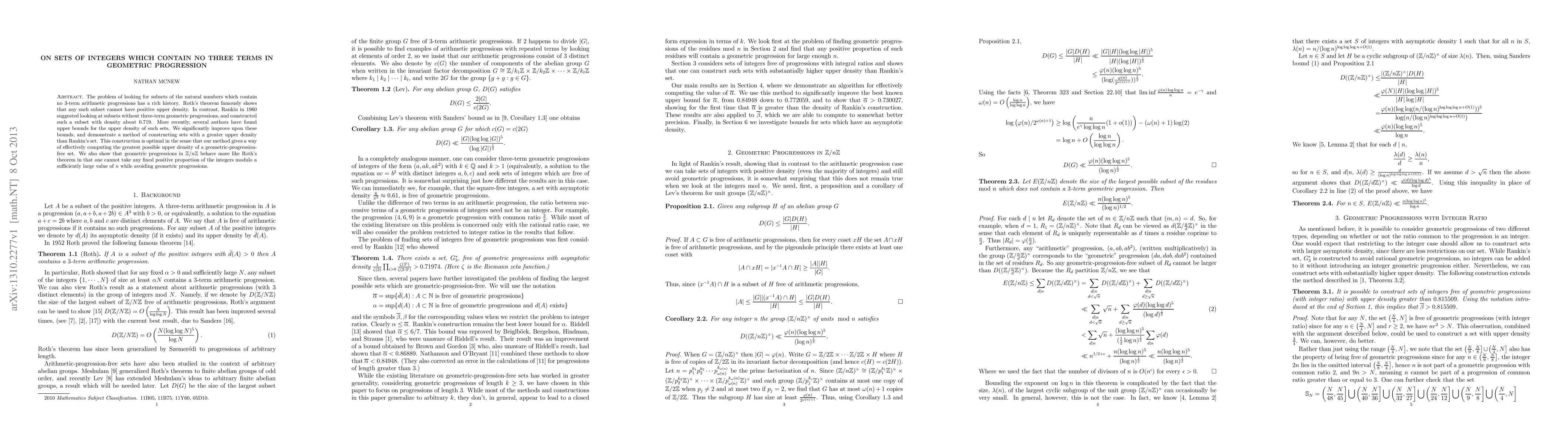 This paper improves the upper density bounds for subsets of natural numbers devoid of three-term geometric progressions, presenting a construction method that surpasses Rankin's density and demonstrating its optimality. It also aligns the behavior of geometric progressions in modular arithmetic with Roth's theorem on arithmetic progressions.