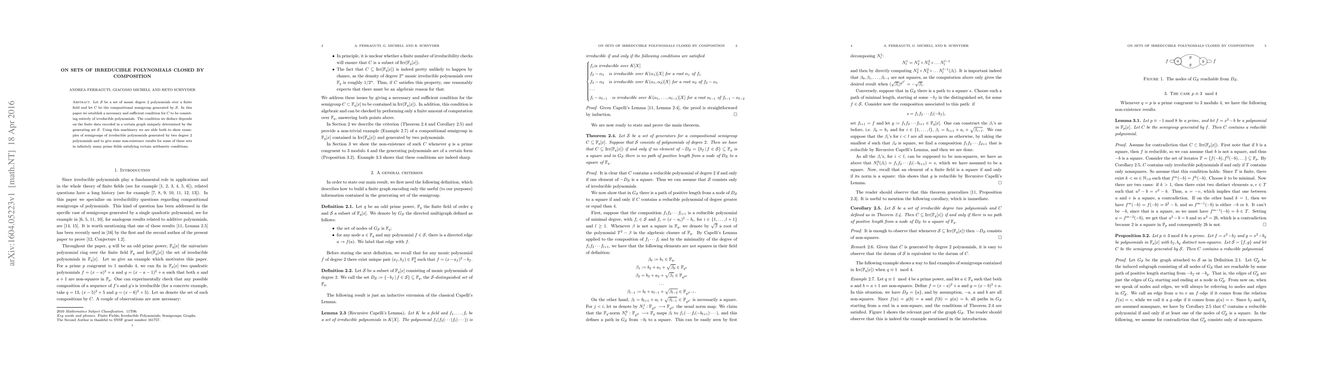 Let $\mathcal S$ be a set of monic degree $2$ polynomials over a finite field and let $C$ be the compositional semigroup generated by $\mathcal S$. In this paper we establish a necessary and sufficient condition for $C$ to be consisting entirely of irreducible polynomials. The condition we deduce depends on the finite data encoded in a certain graph uniquely determined by the generating set $\mathcal S$. Using this machinery we are able both to show examples of semigroups of irreducible polynomials generated by two degree $2$ polynomials and to give some non-existence results for some of these sets in infinitely many prime fields satisfying certain arithmetic conditions.