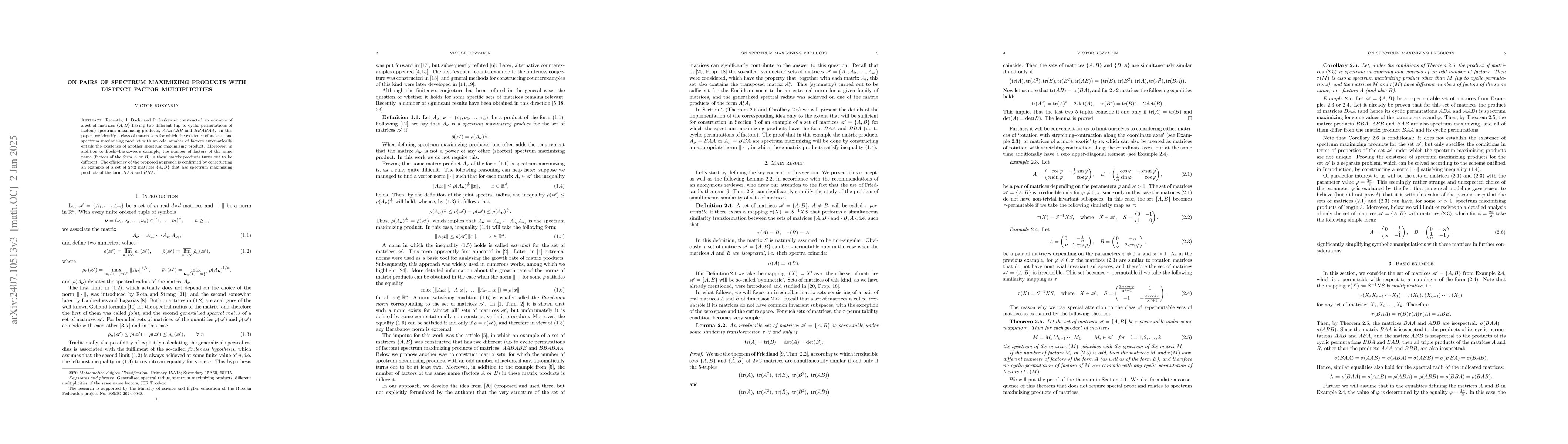 Recently, J. Bochi and P. Laskawiec constructed an example of a set of matrices $\{A,B\}$ having two different (up to cyclic permutations of factors) spectrum maximizing products, $AABABB$ and $BBABAA$. In this paper, we identify a class of matrix sets for which the existence of at least one spectrum maximizing product with an odd number of factors automatically entails the existence of another spectrum maximizing product. Moreover, in addition to Bochi--Laskawiec's example, the number of factors of the same name (factors of the form $A$ or $B$) in these matrix products turns out to be different. The efficiency of the proposed approach is confirmed by constructing an example of a set of $2\times2$ matrices $\{A,B\}$ that has spectrum maximizing products of the form $BAA$ and $BBA$.