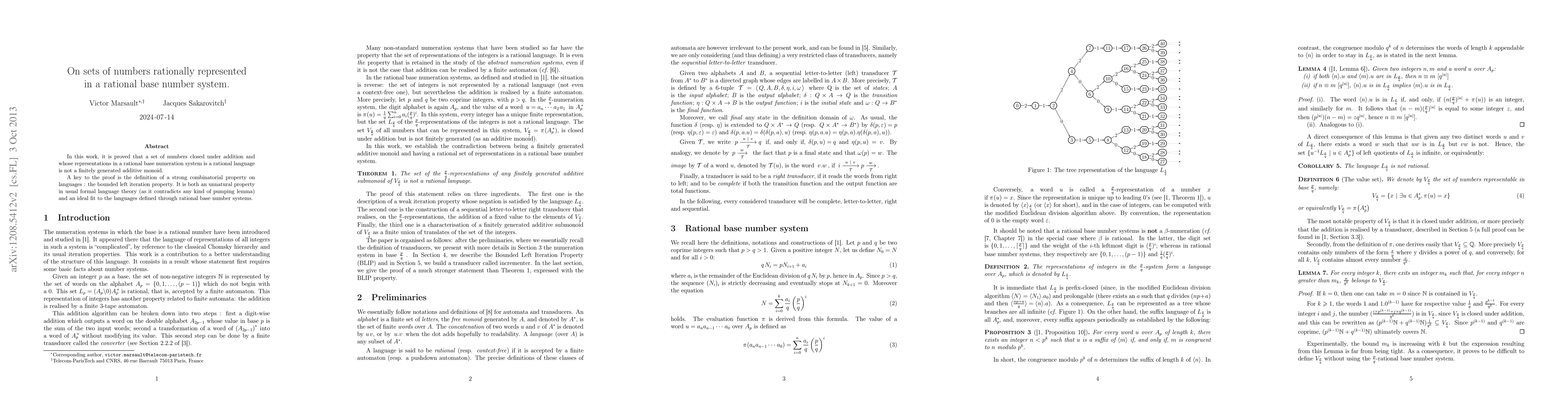 In this work, it is proved that a set of numbers closed under addition and whose representations in a rational base numeration system is a rational language is not a finitely generated additive monoid. A key to the proof is the definition of a strong combinatorial property on languages : the bounded left iteration property. It is both an unnatural property in usual formal language theory (as it contradicts any kind of pumping lemma) and an ideal fit to the languages defined through rational base number systems.