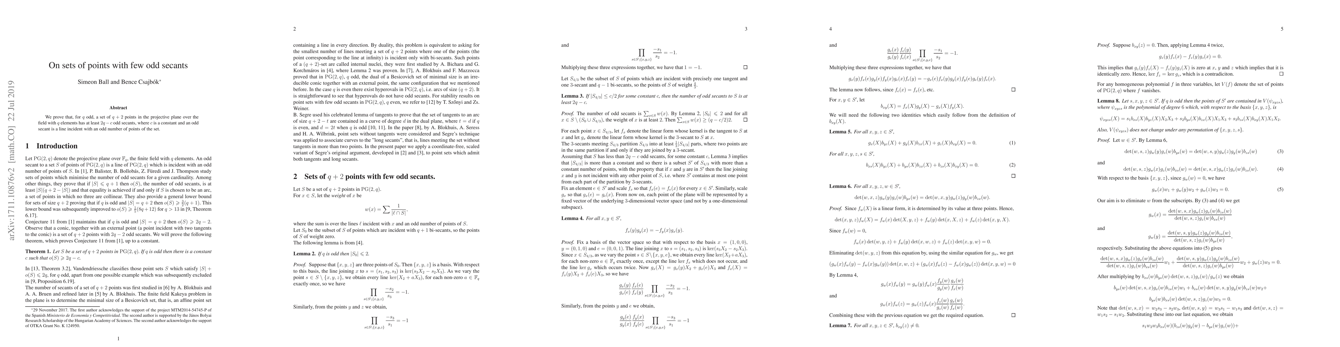 Summary: The paper proves that a set of $q+2$ points in the projective plane over a field with $q$ odd elements must have at least $2q-c$ odd secants, where $c$ is a constant, and an odd secant is a line intersecting an odd number of points in the set.