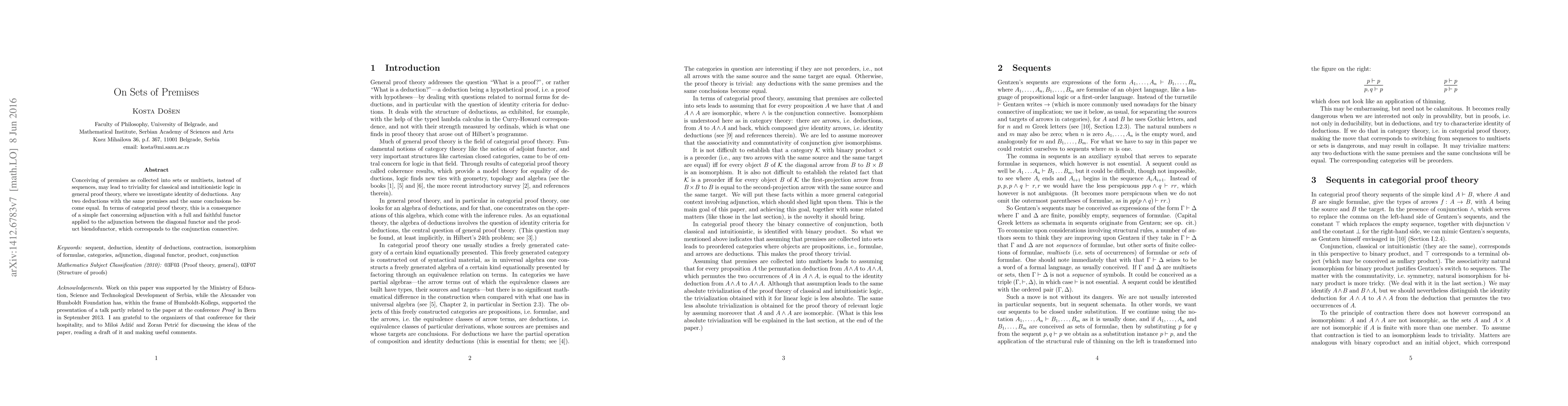 Conceiving of premises as collected into sets or multisets, instead of sequences, may lead to triviality for classical and intuitionistic logic in general proof theory, where we investigate identity of deductions. Any two deductions with the same premises and the same conclusions become equal. In terms of categorial proof theory, this is a consequence of a simple fact concerning adjunction with a full and faithful functor applied to the adjunction between the diagonal functor and the product biendofunctor, which corresponds to the conjunction connective.