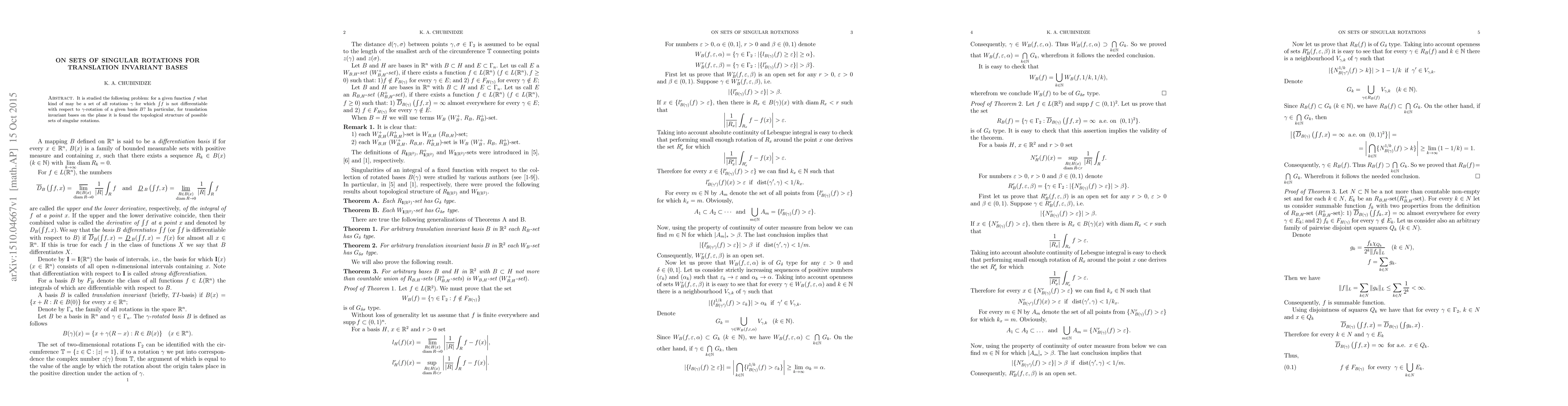 Researchers studied sets of singular rotations that make a translation invariant basis non-differentiable, finding the topological structure of such sets on the plane.