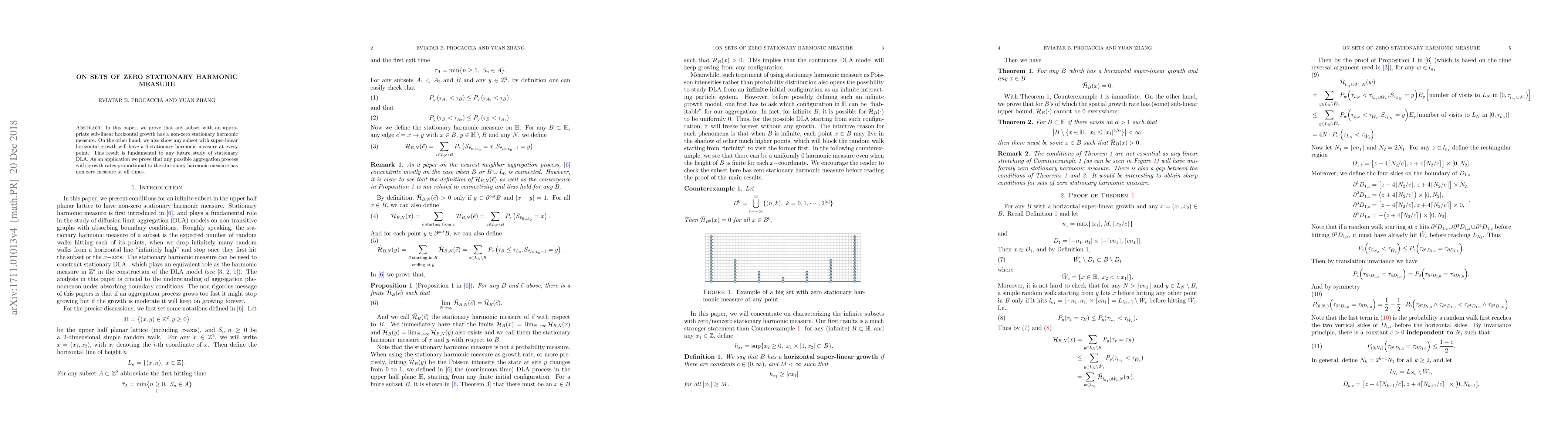 A subset with sub-linear horizontal growth has a non-zero stationary harmonic measure, while one with super-linear growth has zero. This result is fundamental to studying stationary DLA and applies to aggregation processes with proportional growth rates.