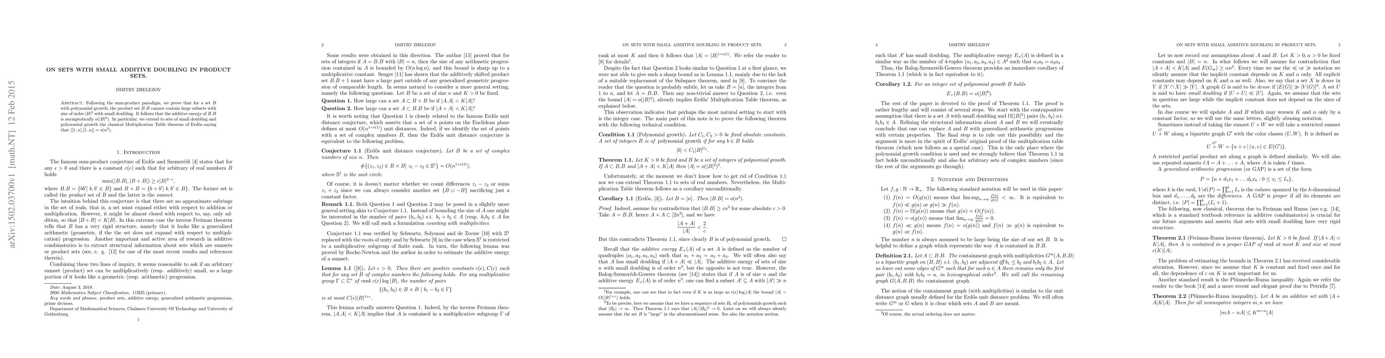 Researchers prove that for sets with polynomial growth, their product set cannot contain large subsets with small doubling, leading to a limited additive energy.