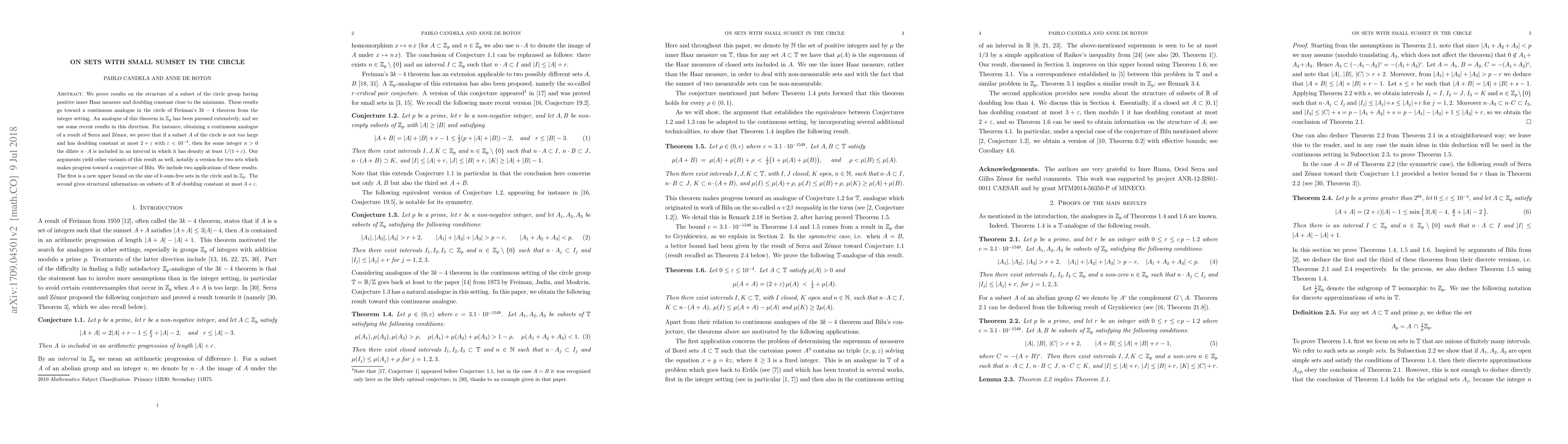 We prove results on the structure of a subset of the circle group having positive inner Haar measure and doubling constant close to the minimum. These results go toward a continuous analogue in the circle of Freiman's $3k-4$ theorem from the integer setting. An analogue of this theorem in $\mathbb{Z}_p$ has been pursued extensively, and we use some recent results in this direction. For instance, obtaining a continuous analogue of a result of Serra and Z\'emor, we prove that if a subset $A$ of the circle is not too large and has doubling constant at most $2+\varepsilon$ with $\varepsilon<10^{-4}$, then for some integer $n>0$ the dilate $n\cdot A$ is included in an interval in which it has density at least $1/(1+\varepsilon)$. Our arguments yield other variants of this result as well, notably a version for two sets which makes progress toward a conjecture of Bilu. We include two applications of these results. The first is a new upper bound on the size of $k$-sum-free sets in the circle and in $\mathbb{Z}_p$. The second gives structural information on subsets of $\mathbb{R}$ of doubling constant at most $3+\varepsilon$.