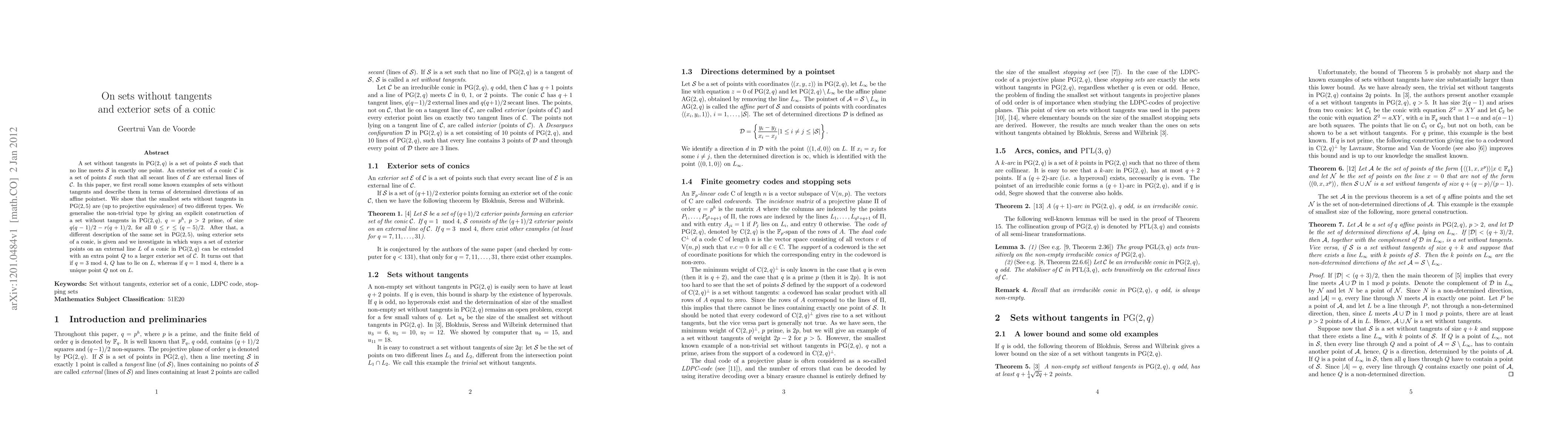 A set without tangents in $\PG(2,q)$ is a set of points S such that no line meets S in exactly one point. An exterior set of a conic $\mathcal{C}$ is a set of points $\E$ such that all secant lines of $\E$ are external lines of $\mathcal{C}$. In this paper, we first recall some known examples of sets without tangents and describe them in terms of determined directions of an affine pointset. We show that the smallest sets without tangents in $\PG(2,5)$ are (up to projective equivalence) of two different types. We generalise the non-trivial type by giving an explicit construction of a set without tangents in $\PG(2,q)$, $q=p^h$, $p>2$ prime, of size $q(q-1)/2-r(q+1)/2$, for all $0\leq r\leq (q-5)/2$. After that, a different description of the same set in $\PG(2,5)$, using exterior sets of a conic, is given and we investigate in which ways a set of exterior points on an external line $L$ of a conic in $\PG(2,q)$ can be extended with an extra point $Q$ to a larger exterior set of $\mathcal{C}$. It turns out that if $q=3$ mod 4, $Q$ has to lie on $L$, whereas if $q=1$ mod 4, there is a unique point $Q$ not on $L$.