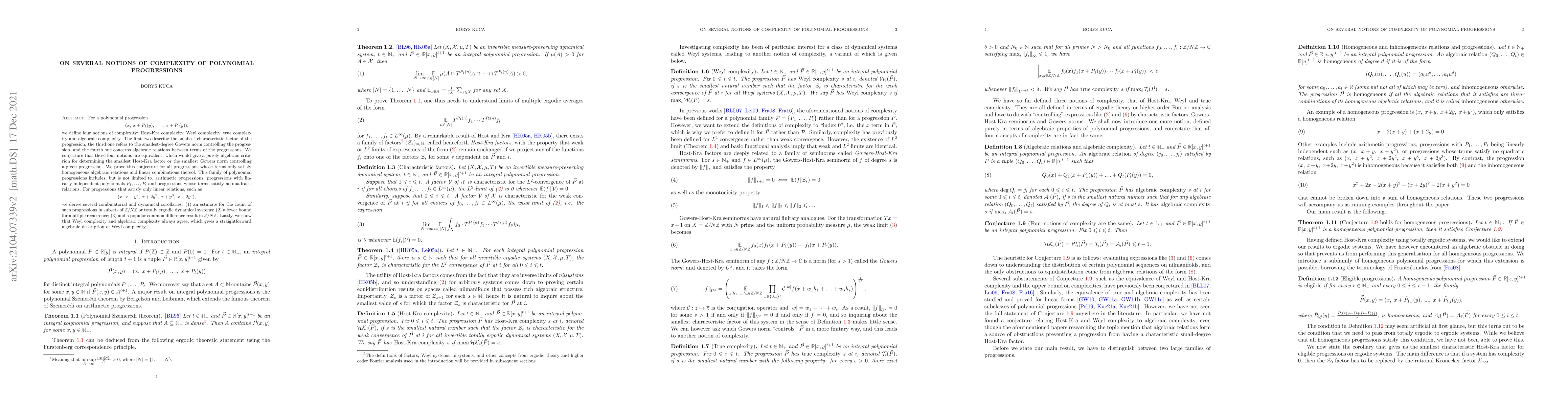 For a polynomial progression $$(x,\; x+P_1(y),\; \ldots,\; x+P_{t}(y)),$$ we define four notions of complexity: Host-Kra complexity, Weyl complexity, true complexity and algebraic complexity. The first two describe the smallest characteristic factor of the progression, the third one refers to the smallest-degree Gowers norm controlling the progression, and the fourth one concerns algebraic relations between terms of the progressions. We conjecture that these four notions are equivalent, which would give a purely algebraic criterion for determining the smallest Host-Kra factor or the smallest Gowers norm controlling a given progression. We prove this conjecture for all progressions whose terms only satisfy homogeneous algebraic relations and linear combinations thereof. This family of polynomial progressions includes, but is not limited to, arithmetic progressions, progressions with linearly independent polynomials $P_1,\; \ldots,\; P_t$ and progressions whose terms satisfy no quadratic relations. For progressions that satisfy only linear relations, such as $$(x,\; x+y^2,\; x+2y^2,\; x+y^3,\; x+2y^3),$$ we derive several combinatorial and dynamical corollaries: (1) an estimate for the count of such progressions in subsets of cyclic groups or totally ergodic dynamical systems; (2) a lower bound for multiple recurrence; (3) and a popular common difference result in cyclic groups. Lastly, we show that Weyl complexity and algebraic complexity always agree, which gives a straightforward algebraic description of Weyl complexity.
